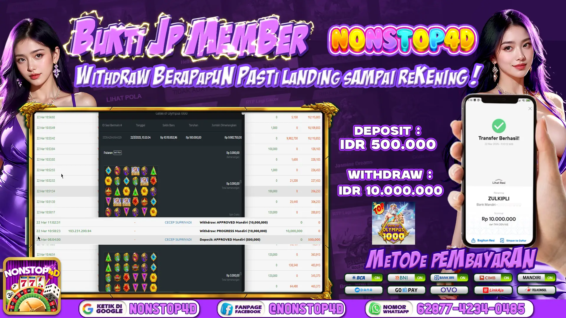 Selamat Kepada ID : Z*****5 Atas Withdraw Rp. 10.000.000 Hari ini. Ditunggu Withdraw Selanjutnya dan ajak juga teman temannya bergabung di Nonstop4d