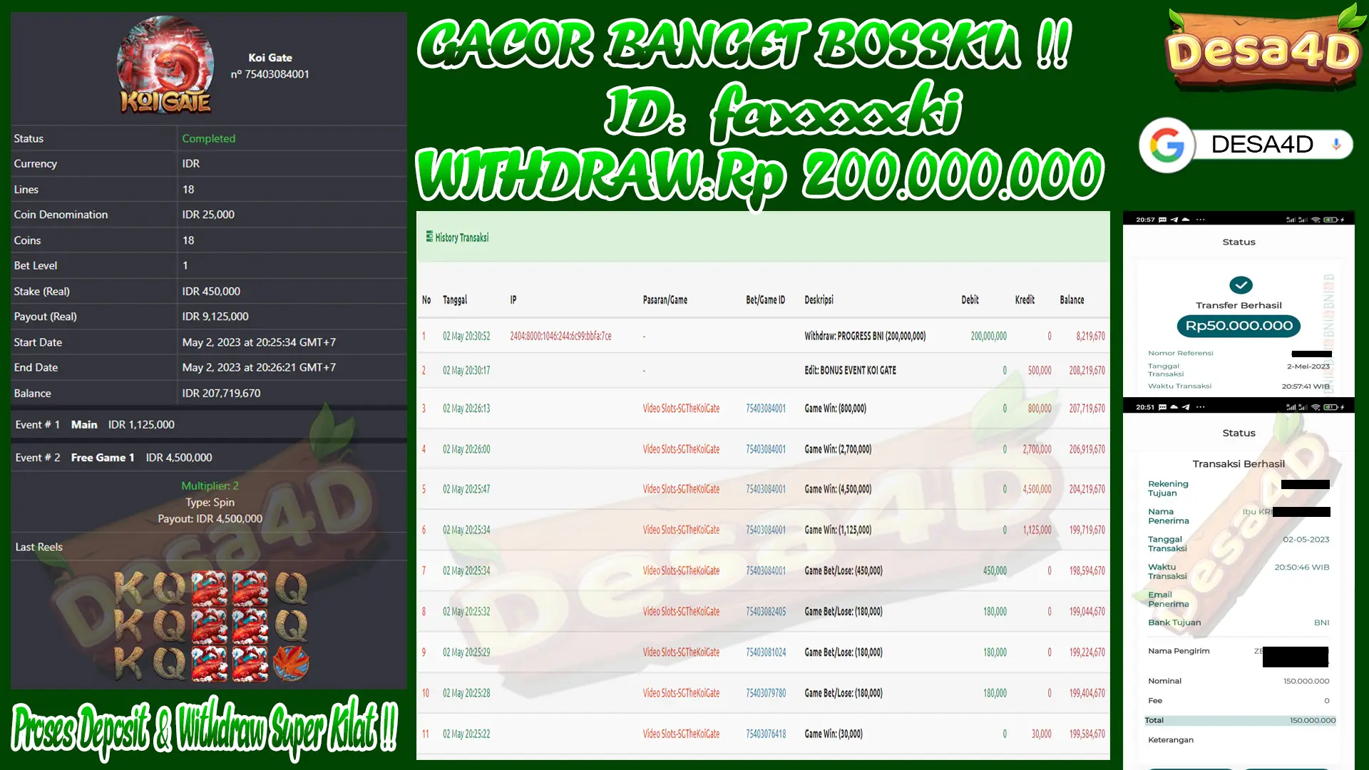 Selamat Kepada ID : FA****KI Atas Withdraw Rp. 200.000.000 Hari ini. Ditunggu Withdraw Selanjutnya dan ajak juga teman temannya bergabung di DESA4D
