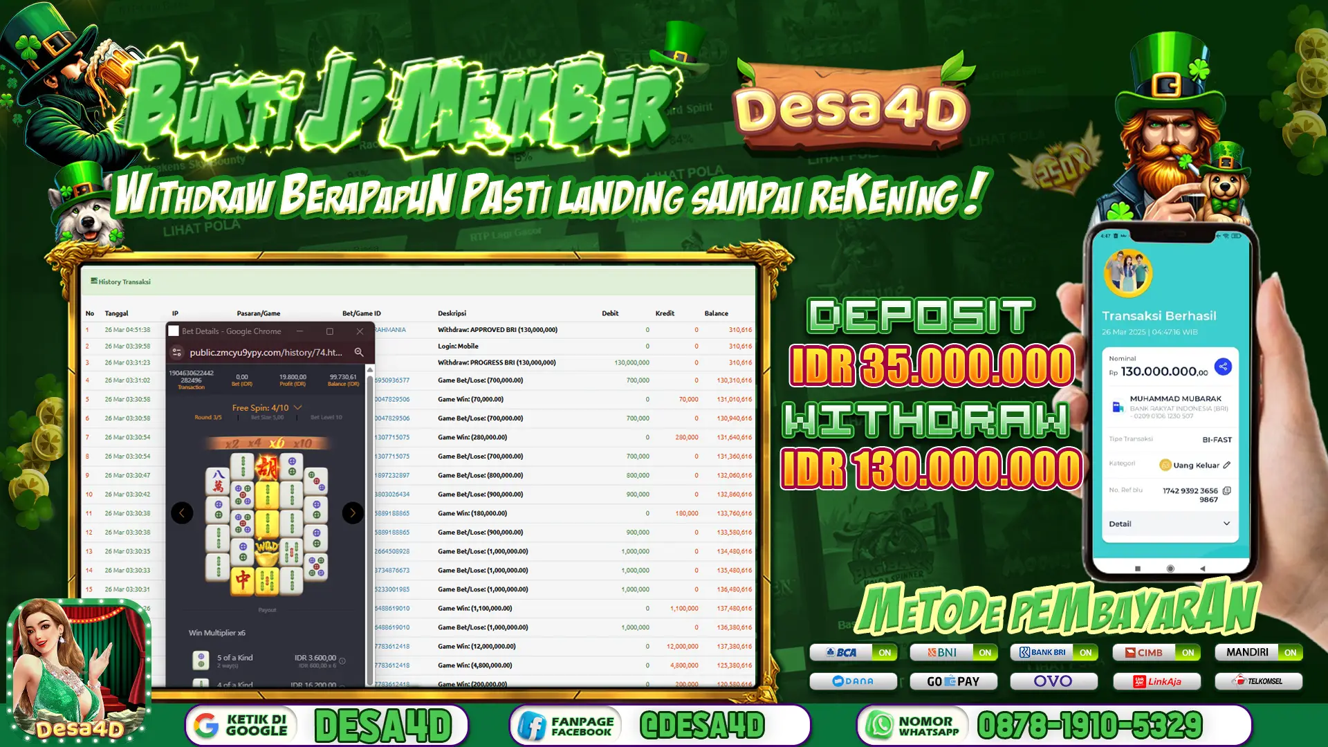 Selamat Kepada ID : M***********K Atas Withdraw Rp. 130.000.000 Hari ini. Ditunggu Withdraw Selanjutnya dan ajak juga teman temannya bergabung di DESA4D