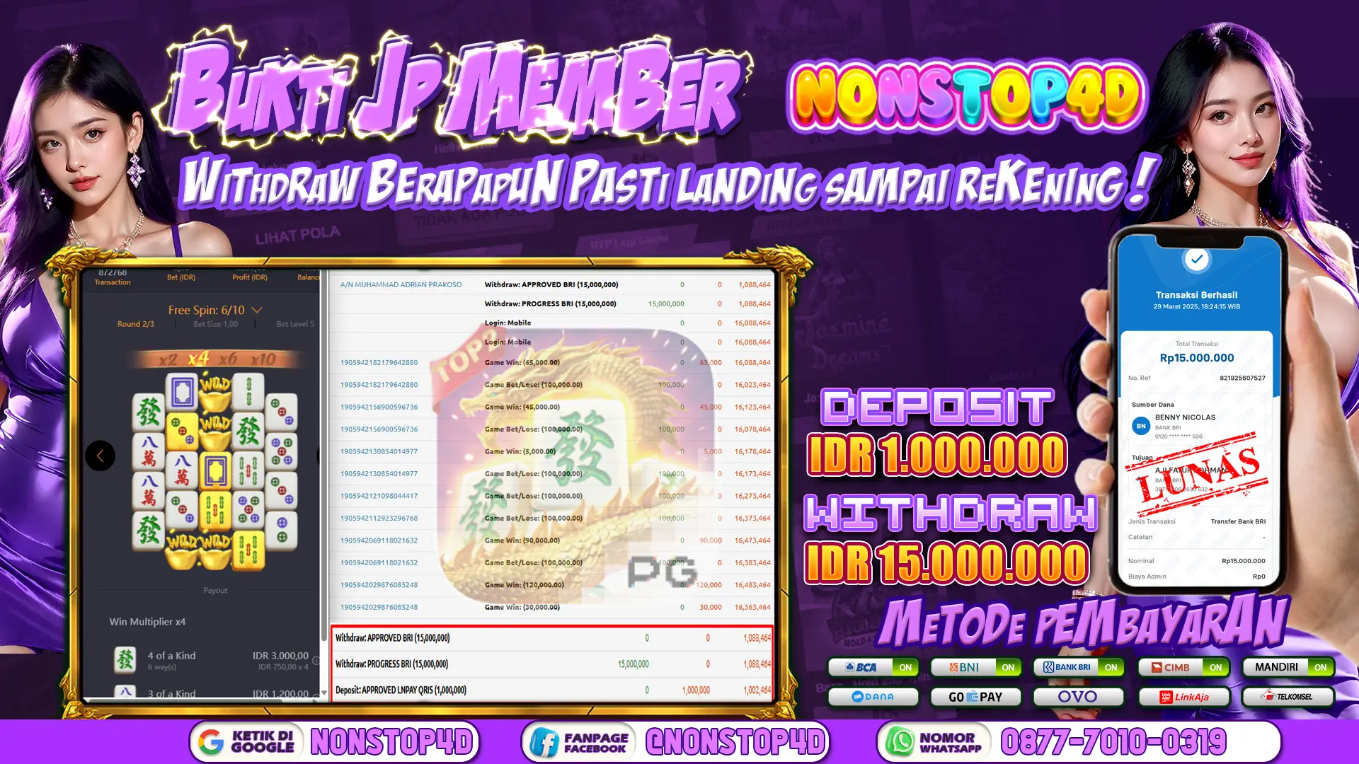 Tak hanya itu, kami juga menyediakan berbagai promo menarik, mulai dari bonus new member, cashback, hingga free spin setiap harinya! Sistem deposit dan withdraw kami cepat serta aman, didukung berbagai metode pembayaran termasuk e-wallet dan bank lokal. Bergabunglah sekarang dan rasakan sendiri keberuntungan Anda di NONSTOP4D Situs Slot Gacor 2025, di mana jackpot besar selalu siap menanti Anda!