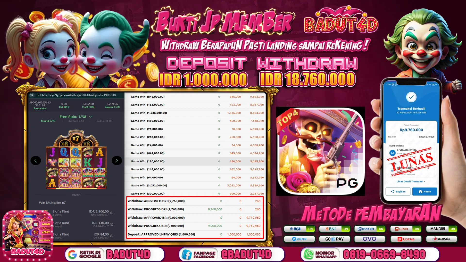 Selamat Kepada ID : R*******N Atas Withdraw Rp. 18.760.000 Hari ini. Ditunggu Withdraw Selanjutnya dan ajak juga teman temannya bergabung di BADUT4D