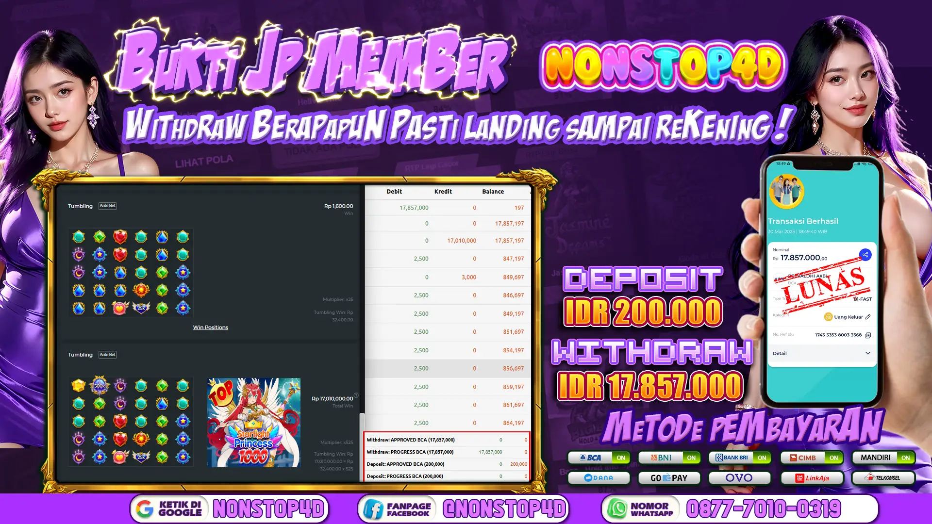 Selamat Kepada ID : D********L Atas Withdraw Rp. 17.857.000 Hari ini. Ditunggu Withdraw Selanjutnya dan ajak juga teman temannya bergabung di NONSTOP4D