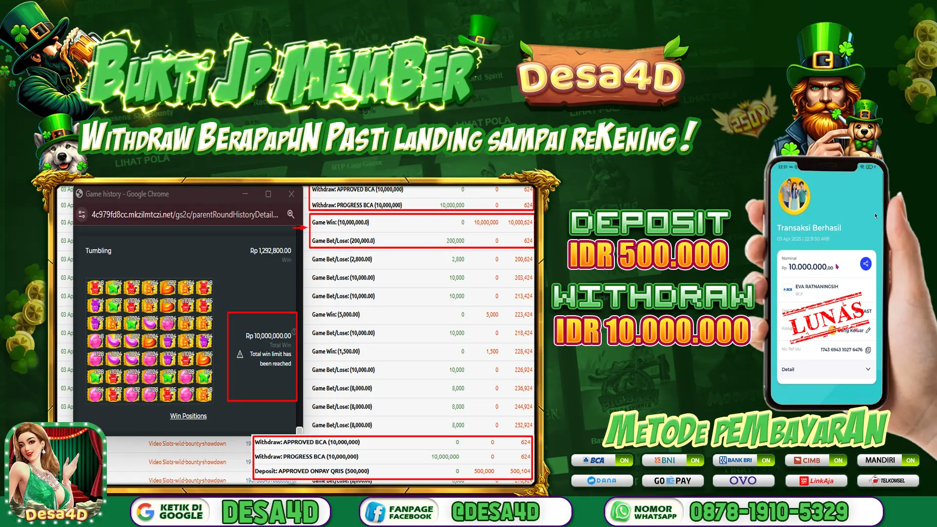 Selamat Kepada ID : E********H Atas Withdraw Rp. 10.000.000 Hari ini. Ditunggu Withdraw Selanjutnya dan ajak juga teman temannya bergabung di DESA4D
