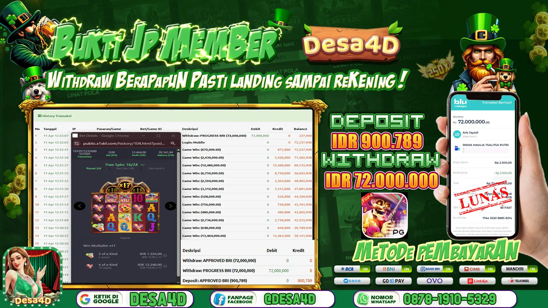 Selamat Kepada ID : R*******I Atas Withdraw Rp. 72.000.000 Hari ini. Ditunggu Withdraw Selanjutnya dan ajak juga teman temannya bergabung di DESA4D