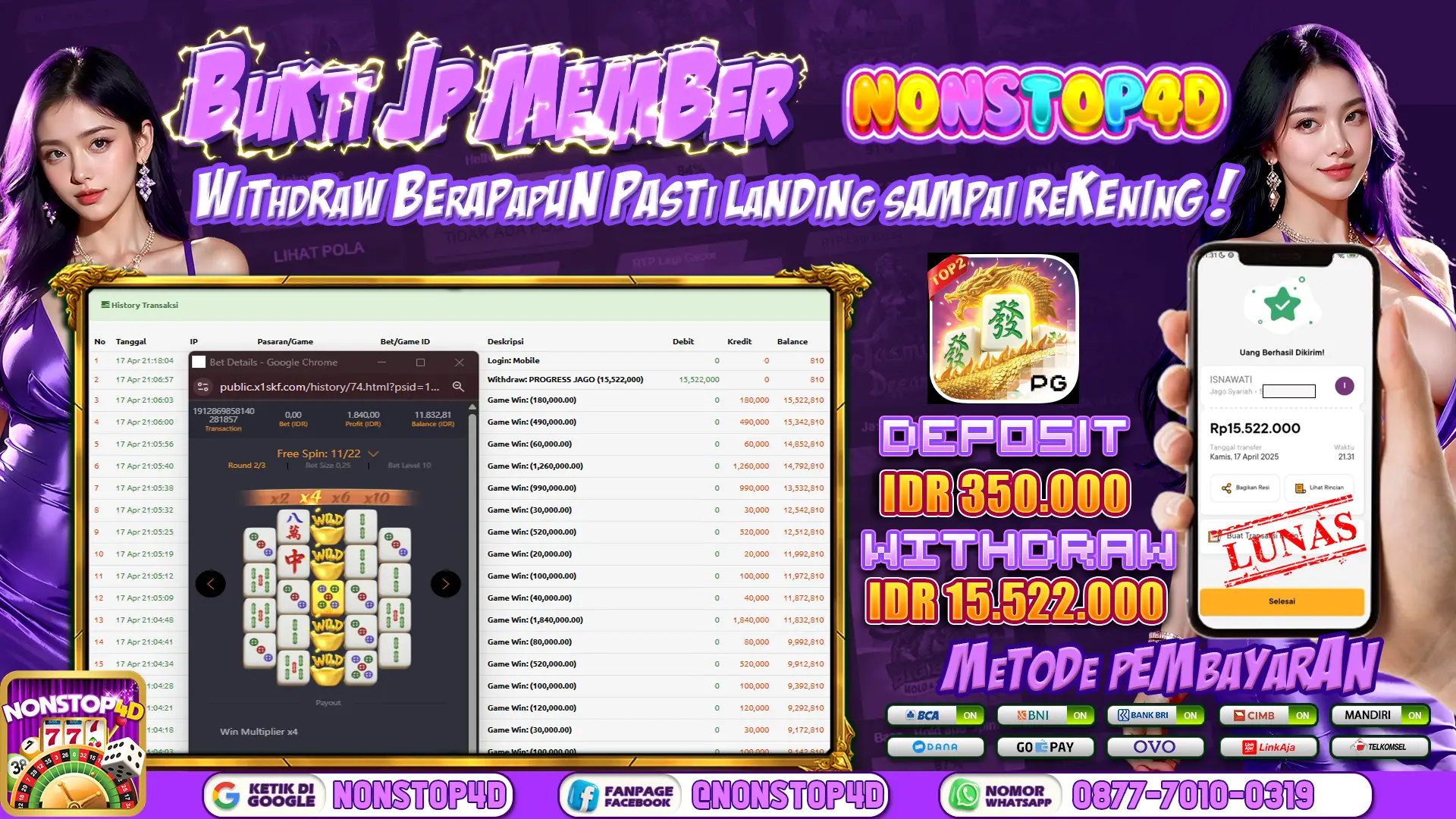 Selamat Kepada ID : I*******I Atas Withdraw Rp. 15.522.000 Hari ini. Ditunggu Withdraw Selanjutnya dan ajak juga teman temannya bergabung di NONSTOP4D
