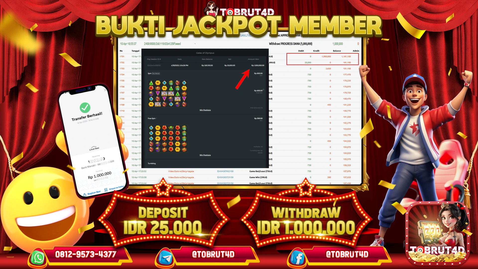 Selamat Kepada ID : C***** Telah berhasil mendapatkan kemenangan besar pada permainan GATES OF OLYMPUS 1000 kemenangan Sebesar 1.000.000,Setelah mengisi formulir withdraw dengan kurung waktu hanya 5 – 10 menit pihak tobrut4d sudah melakukan transfer kepada pemilik Userid dan dana sudah dapat di cairkan oleh pemenang. Bukti pembayaran yang kami berikan merupakan bukti pembayaran yang SAH / VALID yang langung di dapatkan melaui tanda transfer transaksi dari Bank yang di tuju.