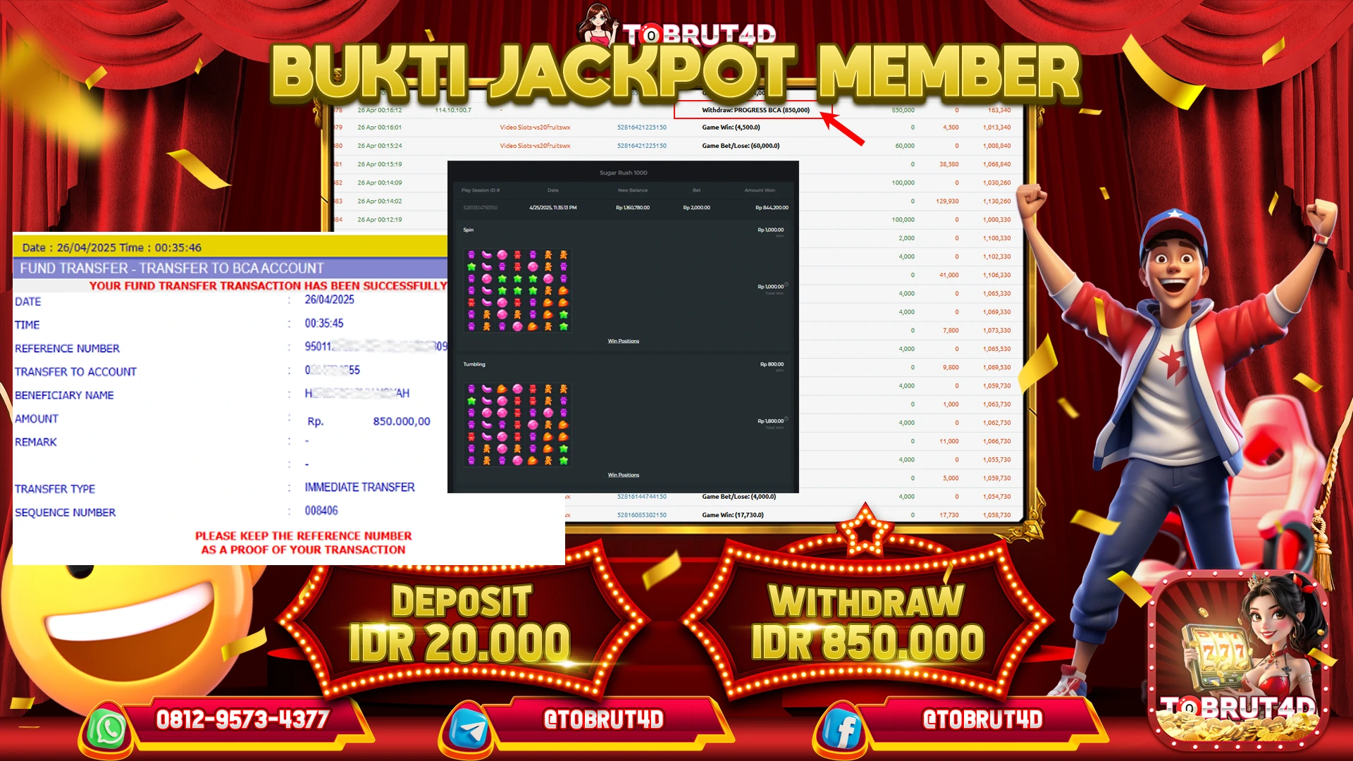 Selamat Kepada ID : V**** Telah berhasil mendapatkan kemenangan besar pada permainan SUGAR RUSH 1000 kemenangan Sebesar 850.000,Setelah mengisi formulir withdraw dengan kurung waktu hanya 5 – 10 menit pihak tobrut4d sudah melakukan transfer kepada pemilik Userid dan dana sudah dapat di cairkan oleh pemenang. Bukti pembayaran yang kami berikan merupakan bukti pembayaran yang SAH / VALID yang langung di dapatkan melaui tanda transfer transaksi dari Bank yang di tuju.