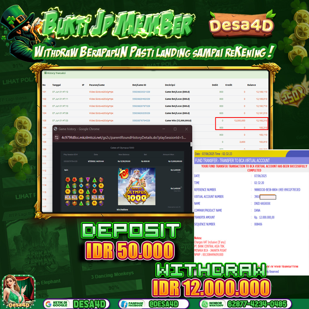 Selamat Kepada ID : F******22 Atas Withdraw Rp. 12.000.000 Hari ini. Ditunggu Withdraw Selanjutnya dan ajak juga teman temannya bergabung di DESA4D