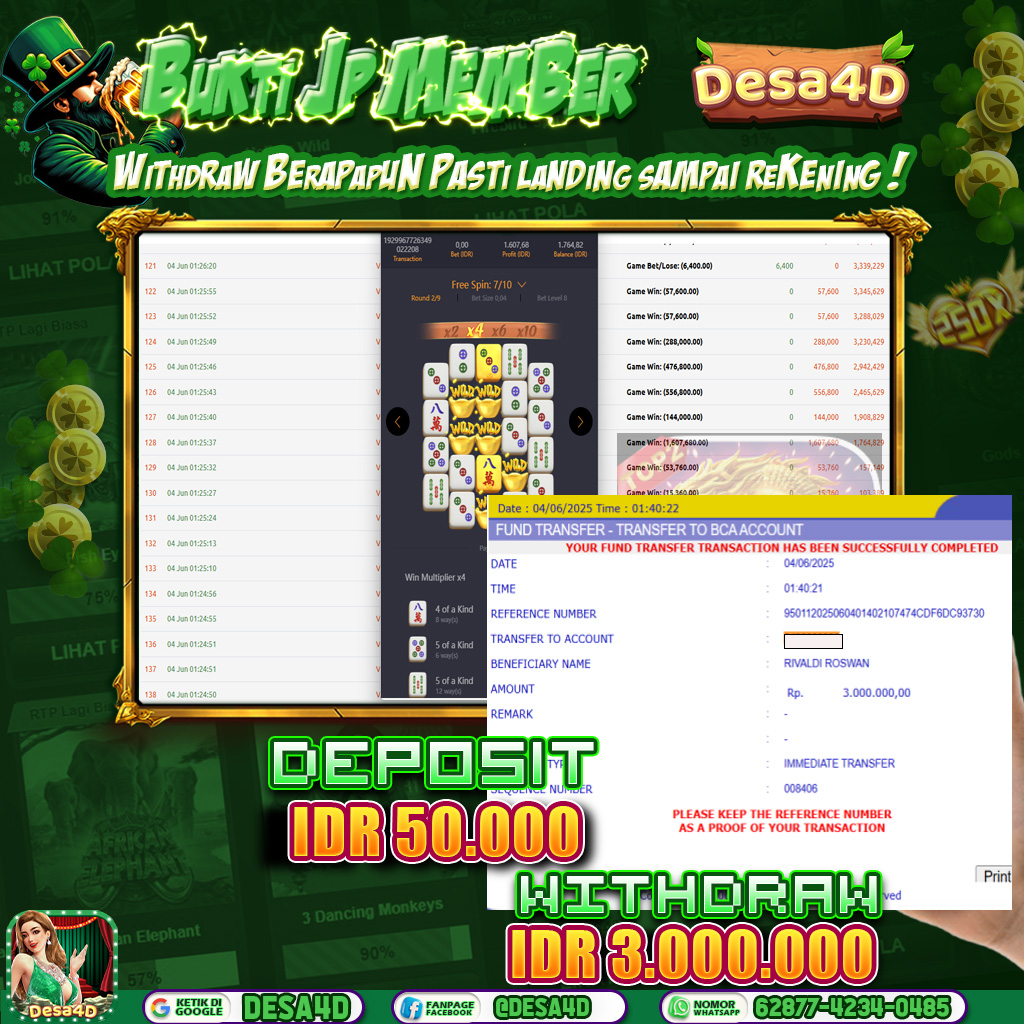 Selamat Kepada ID : GR*****2 Atas Withdraw Rp. 3.000.000 Hari ini. Ditunggu Withdraw Selanjutnya dan ajak juga teman temannya bergabung di DESA4D
