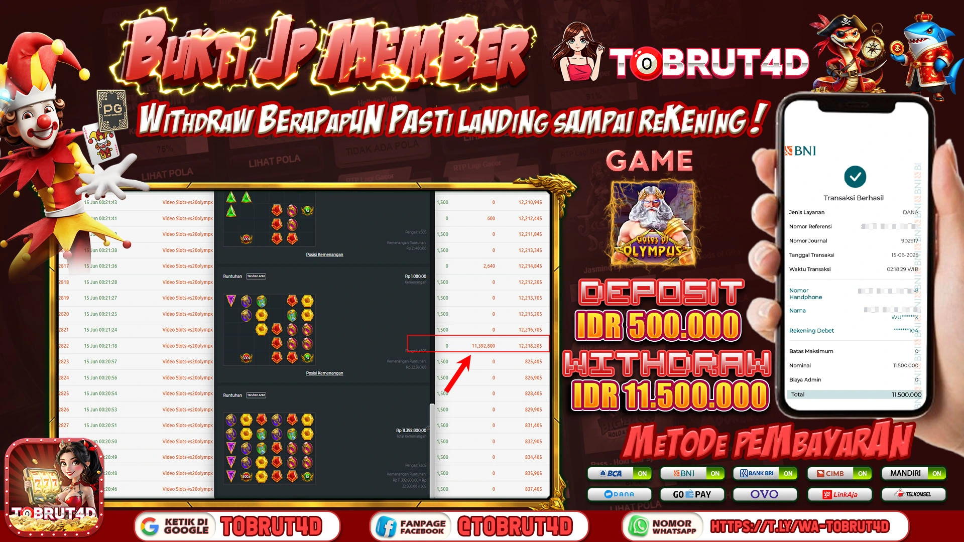 Selamat Kepada ID : T*****N Telah berhasil mendapatkan kemenangan besar pada permainan GATES OF OLYMPUS 1000 kemenangan Sebesar 11.500.000,Setelah mengisi formulir withdraw dengan kurung waktu hanya 5 – 10 menit pihak tobrut4d sudah melakukan transfer kepada pemilik Userid dan dana sudah dapat di cairkan oleh pemenang. Bukti pembayaran yang kami berikan merupakan bukti pembayaran yang SAH / VALID yang langung di dapatkan melaui tanda transfer transaksi dari Bank yang di tuju.