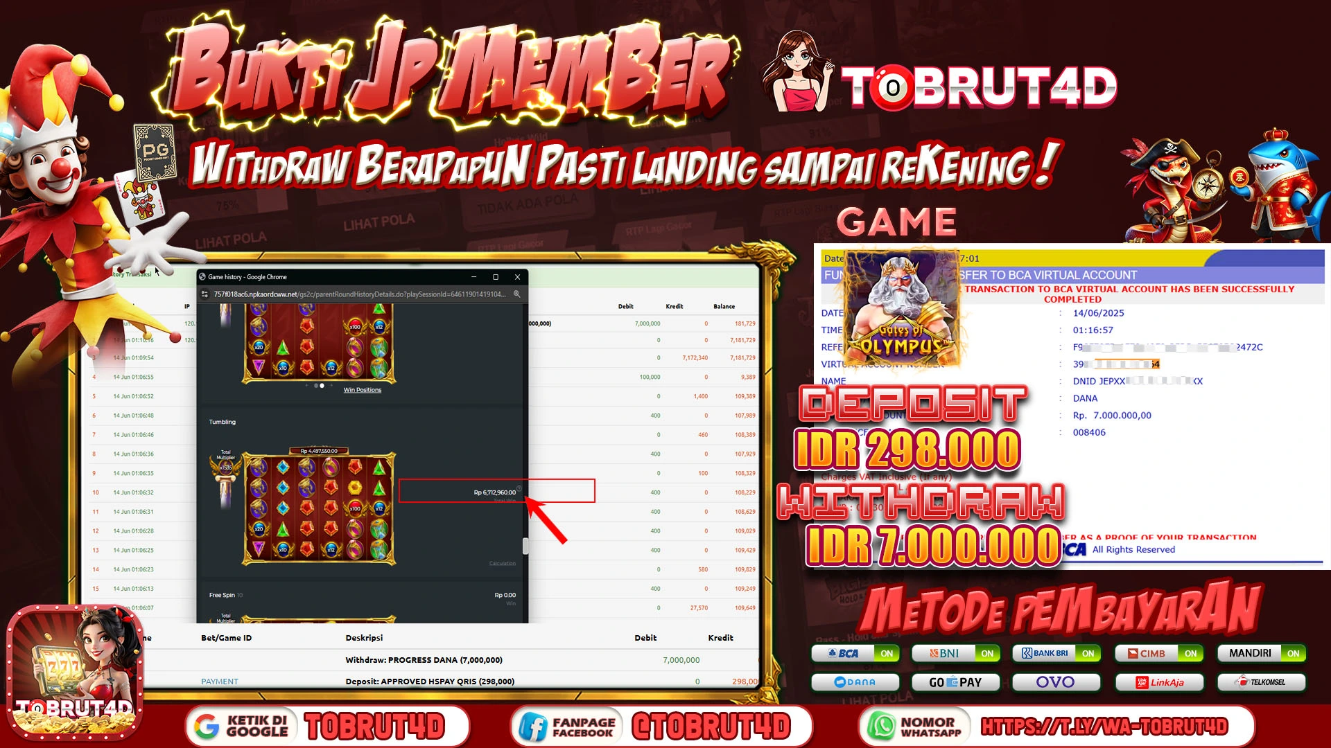 Selamat Kepada ID : V*****123 Telah berhasil mendapatkan kemenangan besar pada permainan GATES OF OLYMPUS 1000 kemenangan Sebesar 7.000.000,Setelah mengisi formulir withdraw dengan kurung waktu hanya 5 – 10 menit pihak tobrut4d sudah melakukan transfer kepada pemilik Userid dan dana sudah dapat di cairkan oleh pemenang. Bukti pembayaran yang kami berikan merupakan bukti pembayaran yang SAH / VALID yang langung di dapatkan melaui tanda transfer transaksi dari Bank yang di tuju.