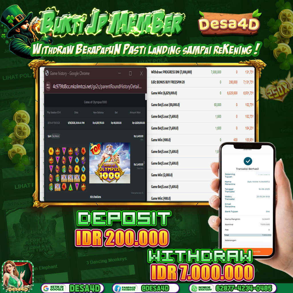 Selamat kepada ID : AS****11 Atas Withdraw Rp. 7.000.000 Hari ini. Ditunggu withdraw selanjutnya dan ajak juga teman temannya bergabung di DESA4D