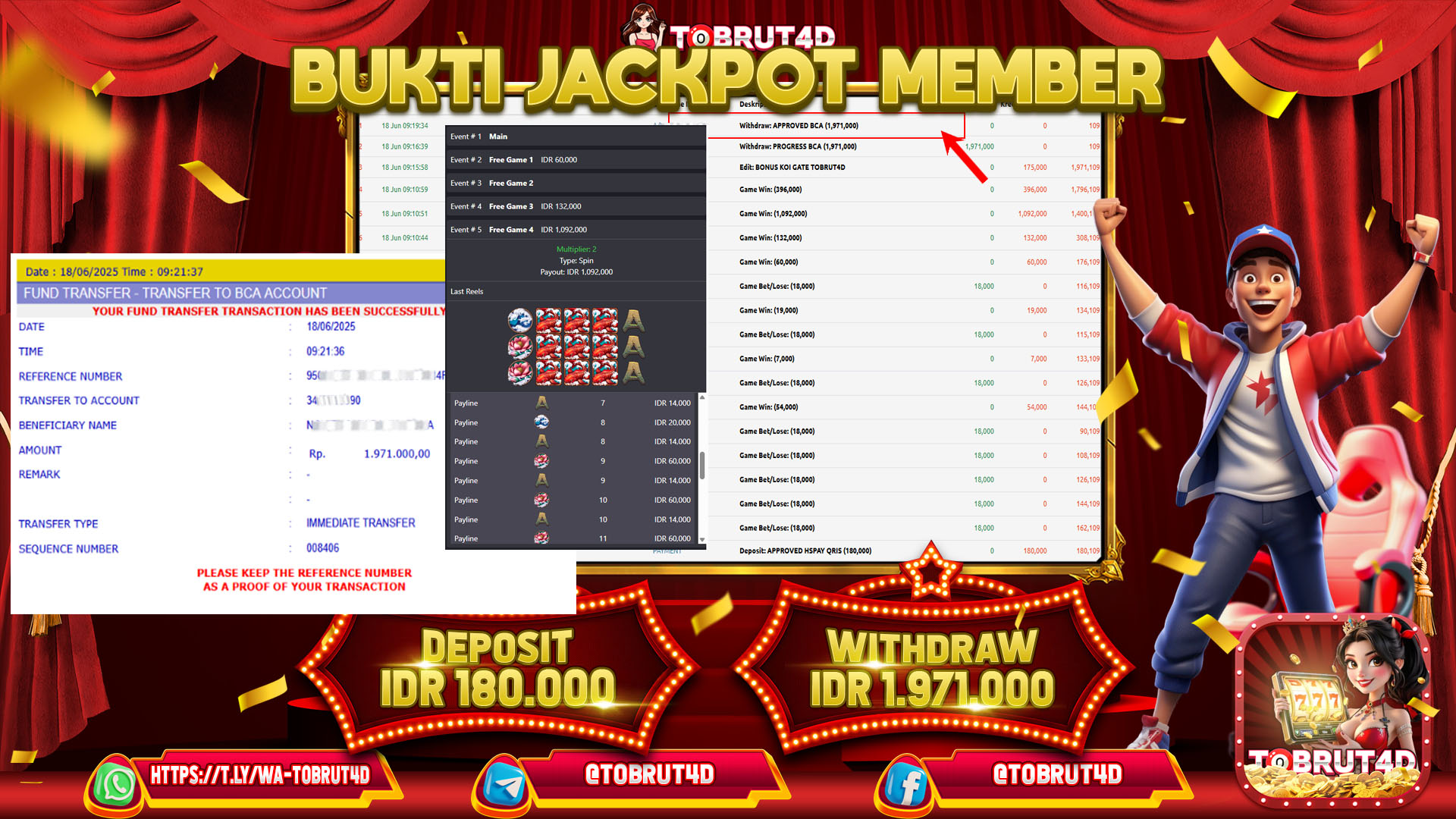 Selamat Kepada ID : GH*****V Telah berhasil mendapatkan kemenangan besar pada permainan KOI GATE kemenangan Sebesar 1.971.000,Setelah mengisi formulir withdraw dengan kurung waktu hanya 5 – 10 menit pihak tobrut4d sudah melakukan transfer kepada pemilik Userid dan dana sudah dapat di cairkan oleh pemenang. Bukti pembayaran yang kami berikan merupakan bukti pembayaran yang SAH / VALID yang langung di dapatkan melaui tanda transfer transaksi dari Bank yang di tuju.