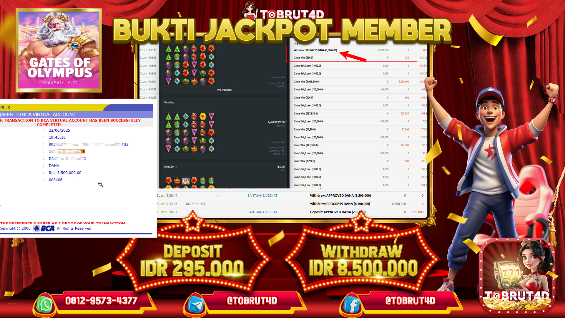 Selamat Kepada ID : R*****R Telah berhasil mendapatkan kemenangan besar pada permainan GATES OF OLYMPUS 1000 kemenangan Sebesar 8.500.000,Setelah mengisi formulir withdraw dengan kurung waktu hanya 5 – 10 menit pihak tobrut4d sudah melakukan transfer kepada pemilik Userid dan dana sudah dapat di cairkan oleh pemenang. Bukti pembayaran yang kami berikan merupakan bukti pembayaran yang SAH / VALID yang langung di dapatkan melaui tanda transfer transaksi dari Bank yang di tuju.
