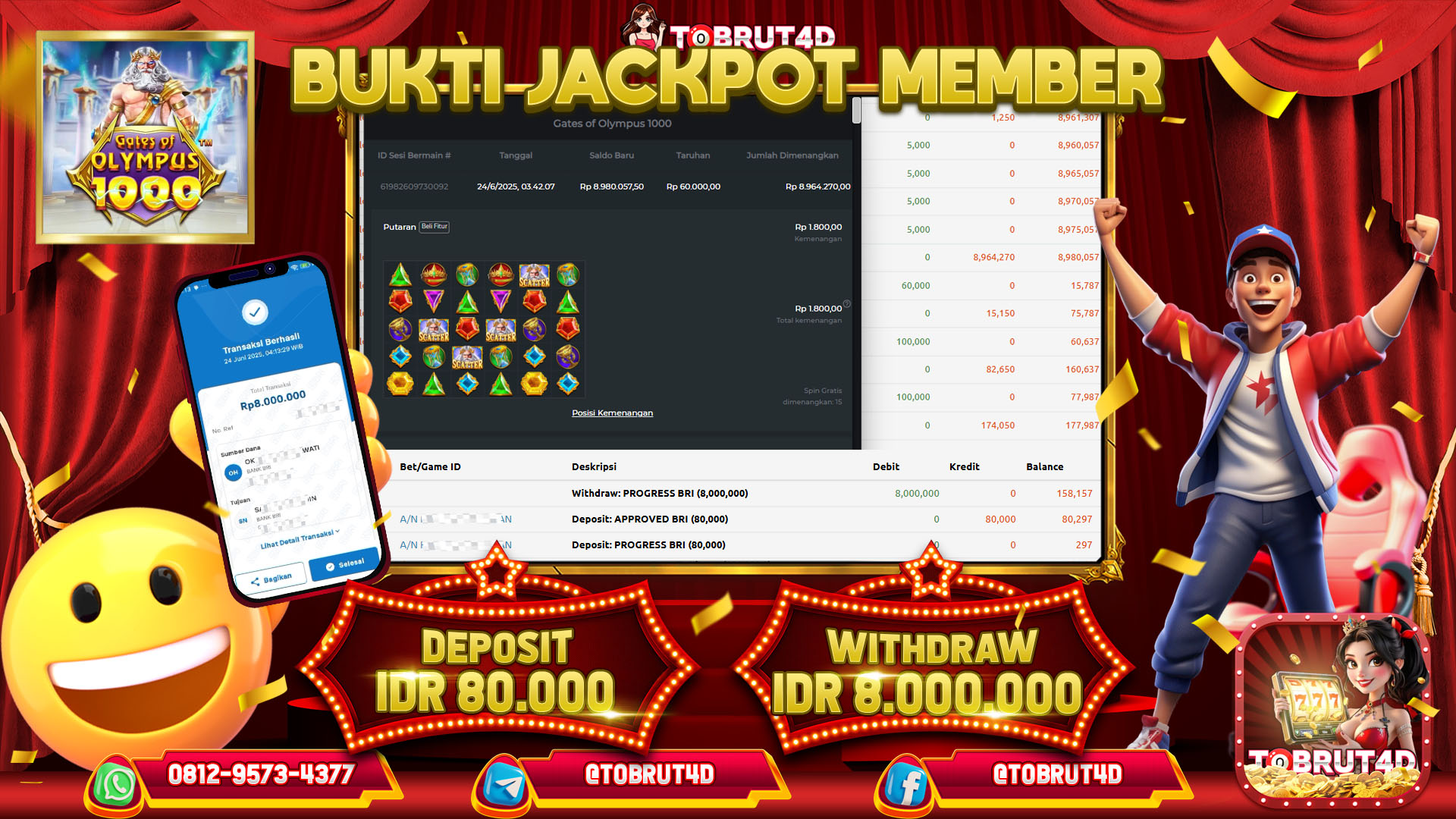 Selamat Kepada ID : P****56 Telah berhasil mendapatkan kemenangan besar pada permainan GATES OF OLYMPUS 1000 kemenangan Sebesar 8.000.000,Setelah mengisi formulir withdraw dengan kurung waktu hanya 5 – 10 menit pihak tobrut4d sudah melakukan transfer kepada pemilik Userid dan dana sudah dapat di cairkan oleh pemenang. Bukti pembayaran yang kami berikan merupakan bukti pembayaran yang SAH / VALID yang langung di dapatkan melaui tanda transfer transaksi dari Bank yang di tuju.