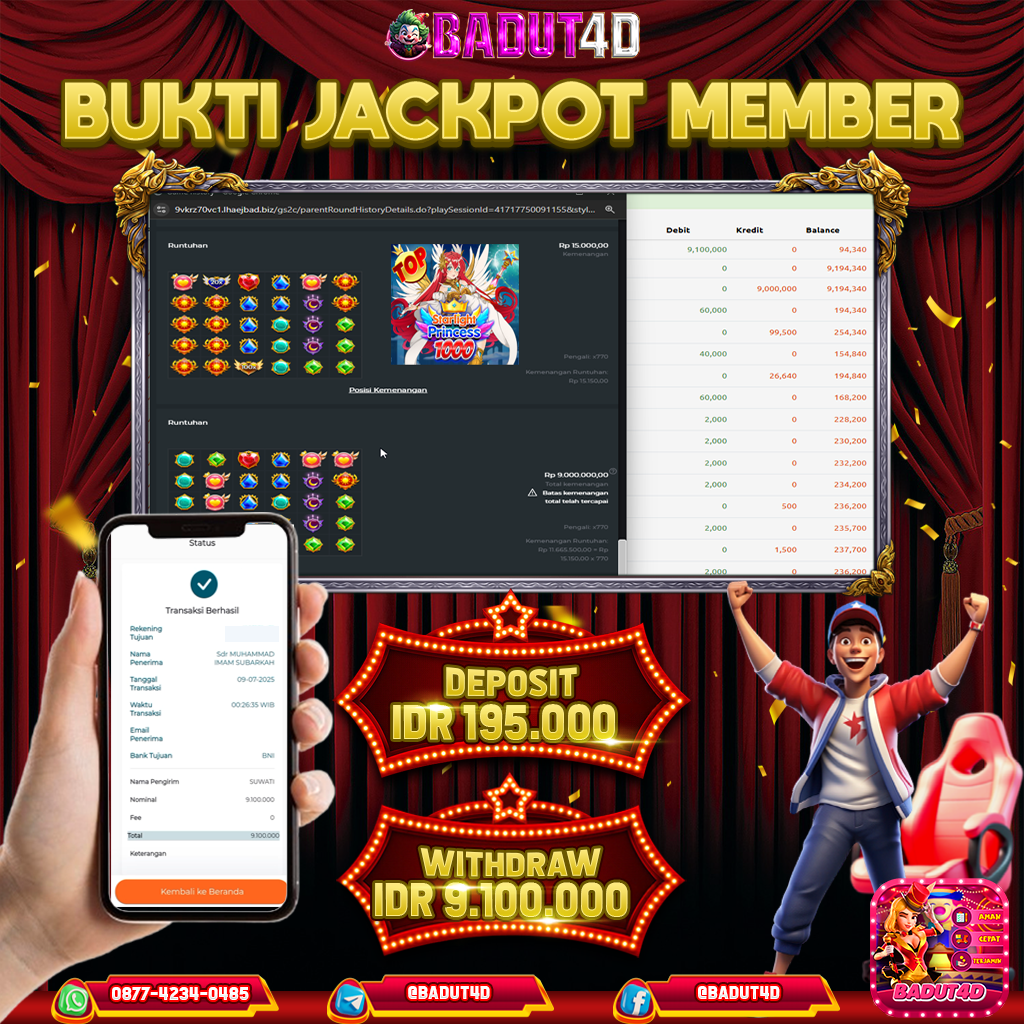 Selamat kepada ID : KOM****17 Atas Withdraw Rp. 9.100.000 Hari ini. Ditunggu withdraw selanjutnya dan ajak juga teman temannya bergabung di BADUT4D