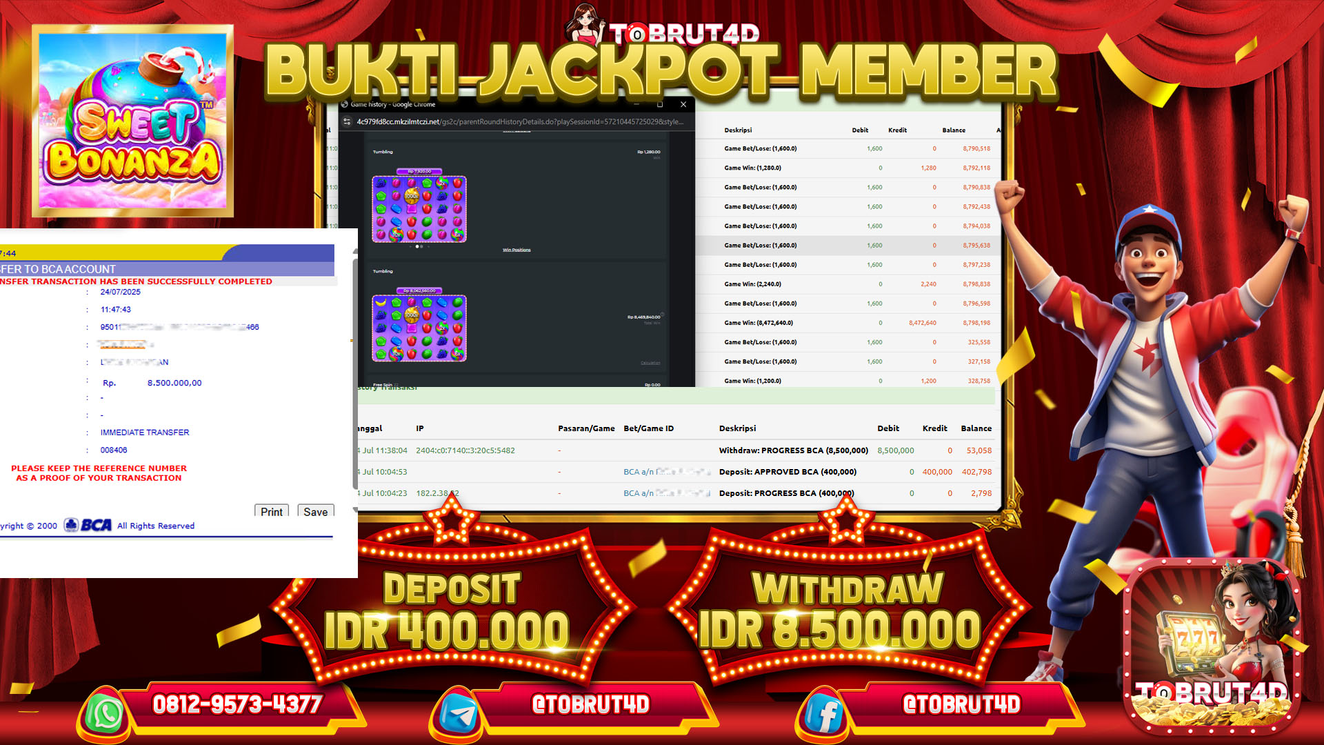 Selamat Kepada ID : H*****III Telah berhasil mendapatkan kemenangan besar pada permainan SWEET BONANZA 1000 kemenangan Sebesar 8.500.000,Setelah mengisi formulir withdraw dengan kurung waktu hanya 5 – 10 menit pihak tobrut4d sudah melakukan transfer kepada pemilik Userid dan dana sudah dapat di cairkan oleh pemenang. Bukti pembayaran yang kami berikan merupakan bukti pembayaran yang SAH / VALID yang langung di dapatkan melaui tanda transfer transaksi dari Bank yang di tuju.
