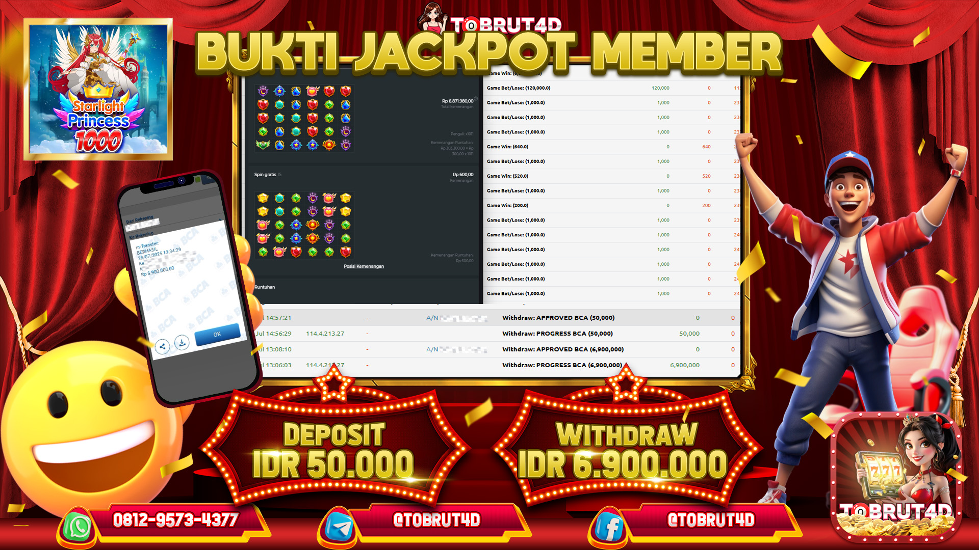 Selamat Kepada ID : NM*****16 Telah berhasil mendapatkan kemenangan besar pada permainan STARLIGHT PRINCESS 1000 kemenangan Sebesar 6.900.000,Setelah mengisi formulir withdraw dengan kurung waktu hanya 5 – 10 menit pihak tobrut4d sudah melakukan transfer kepada pemilik Userid dan dana sudah dapat di cairkan oleh pemenang. Bukti pembayaran yang kami berikan merupakan bukti pembayaran yang SAH / VALID yang langung di dapatkan melaui tanda transfer transaksi dari Bank yang di tuju.