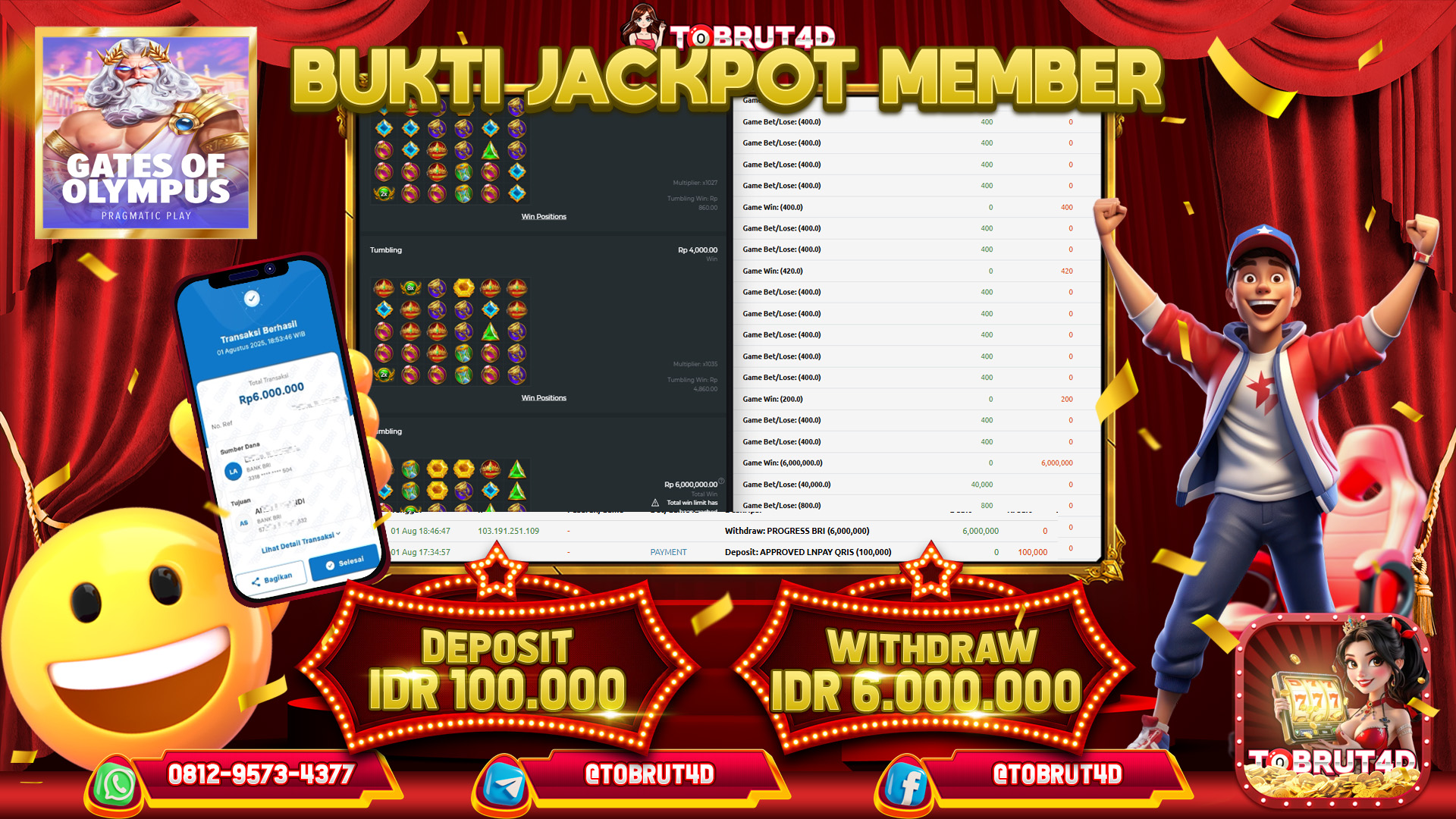Selamat Kepada ID : D*****C Telah berhasil mendapatkan kemenangan besar pada permainan GATES OF OLYMPUS 1000 kemenangan Sebesar 6.000.000,Setelah mengisi formulir withdraw dengan kurung waktu hanya 5 – 10 menit pihak tobrut4d sudah melakukan transfer kepada pemilik Userid dan dana sudah dapat di cairkan oleh pemenang. Bukti pembayaran yang kami berikan merupakan bukti pembayaran yang SAH / VALID yang langung di dapatkan melaui tanda transfer transaksi dari Bank yang di tuju.