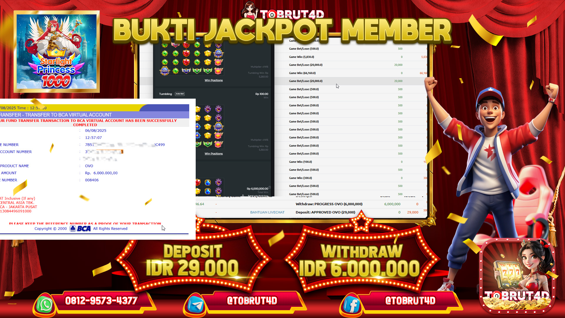 Selamat Kepada ID : N*****78 Telah berhasil mendapatkan kemenangan besar pada permainan STARLIGHT PRINCESS 1000 kemenangan Sebesar 6.000.000,Setelah mengisi formulir withdraw dengan kurung waktu hanya 5 – 10 menit pihak tobrut4d sudah melakukan transfer kepada pemilik Userid dan dana sudah dapat di cairkan oleh pemenang. Bukti pembayaran yang kami berikan merupakan bukti pembayaran yang SAH / VALID yang langung di dapatkan melaui tanda transfer transaksi dari Bank yang di tuju.