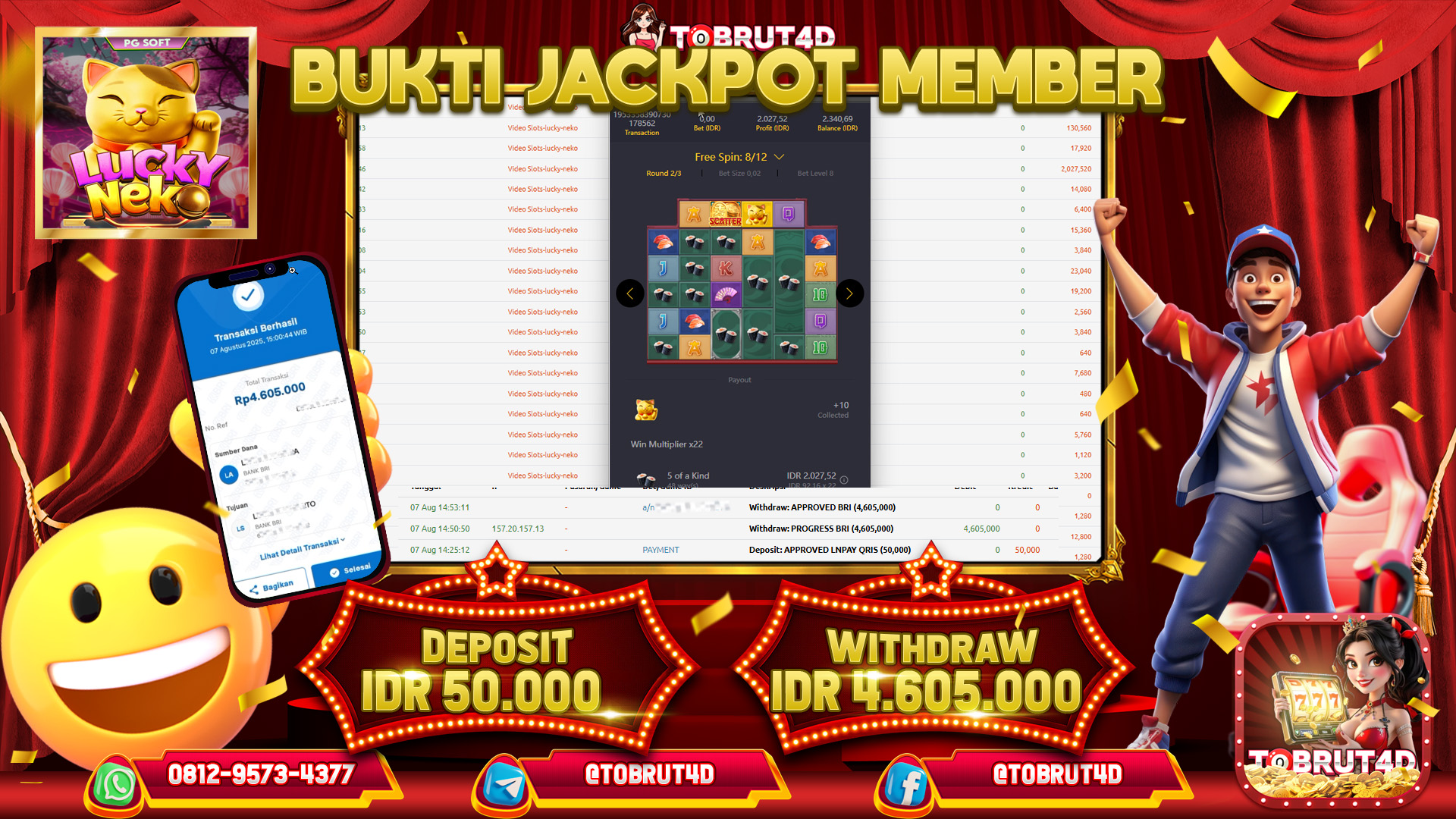 Selamat Kepada ID : U*****B Telah berhasil mendapatkan kemenangan besar pada permainan LUCKY NEKO kemenangan Sebesar 4.605.000,Setelah mengisi formulir withdraw dengan kurung waktu hanya 5 – 10 menit pihak tobrut4d sudah melakukan transfer kepada pemilik Userid dan dana sudah dapat di cairkan oleh pemenang. Bukti pembayaran yang kami berikan merupakan bukti pembayaran yang SAH / VALID yang langung di dapatkan melaui tanda transfer transaksi dari Bank yang di tuju.