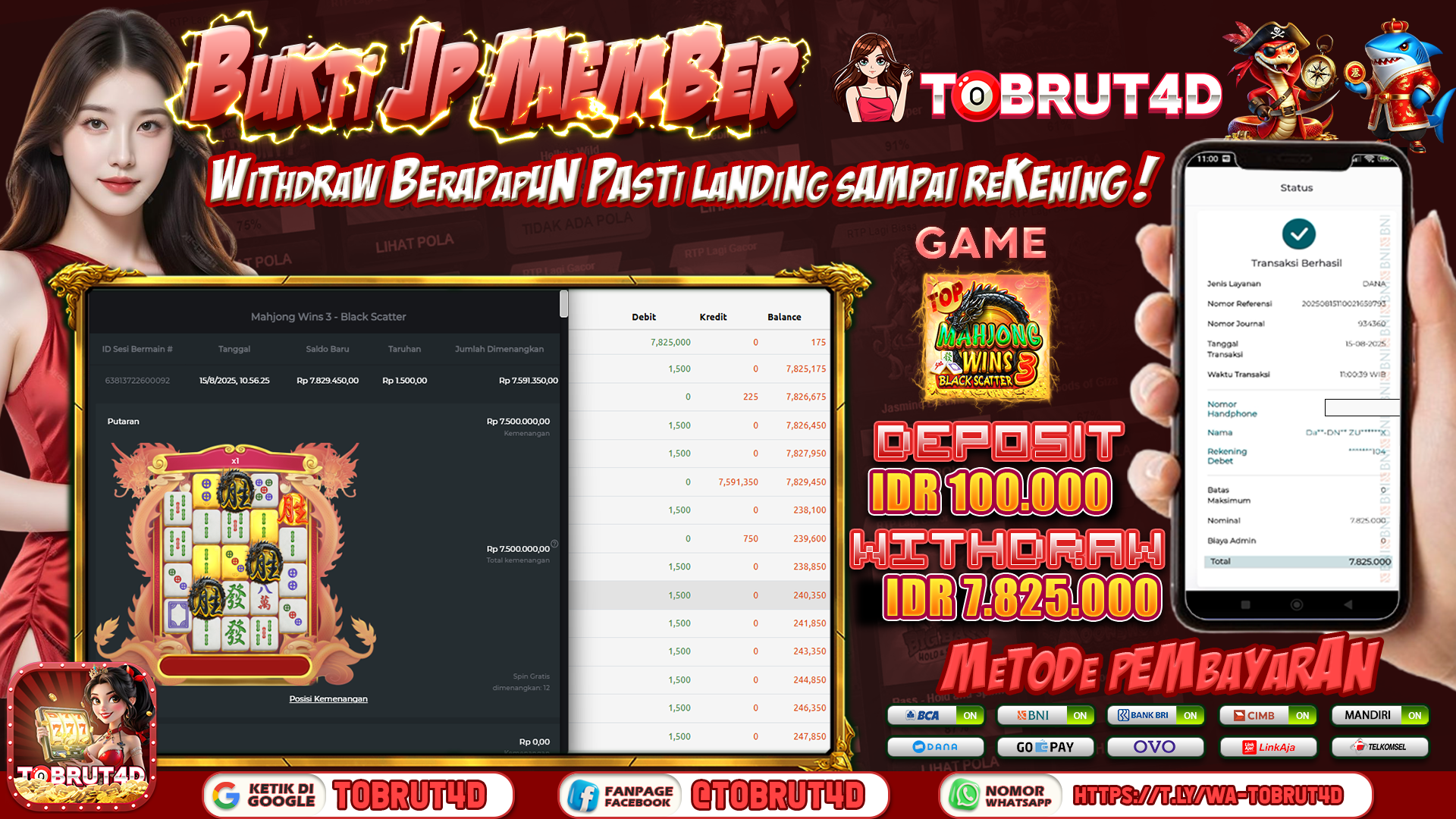 Selamat Kepada ID : GA*****H Telah berhasil mendapatkan kemenangan besar pada permainan MAHJONG WINS 3 BLACK SCATTER kemenangan Sebesar 7.825.000,Setelah mengisi formulir withdraw dengan kurung waktu hanya 5 – 10 menit pihak tobrut4d sudah melakukan transfer kepada pemilik Userid dan dana sudah dapat di cairkan oleh pemenang. Bukti pembayaran yang kami berikan merupakan bukti pembayaran yang SAH / VALID yang langung di dapatkan melaui tanda transfer transaksi dari Bank yang di tuju.