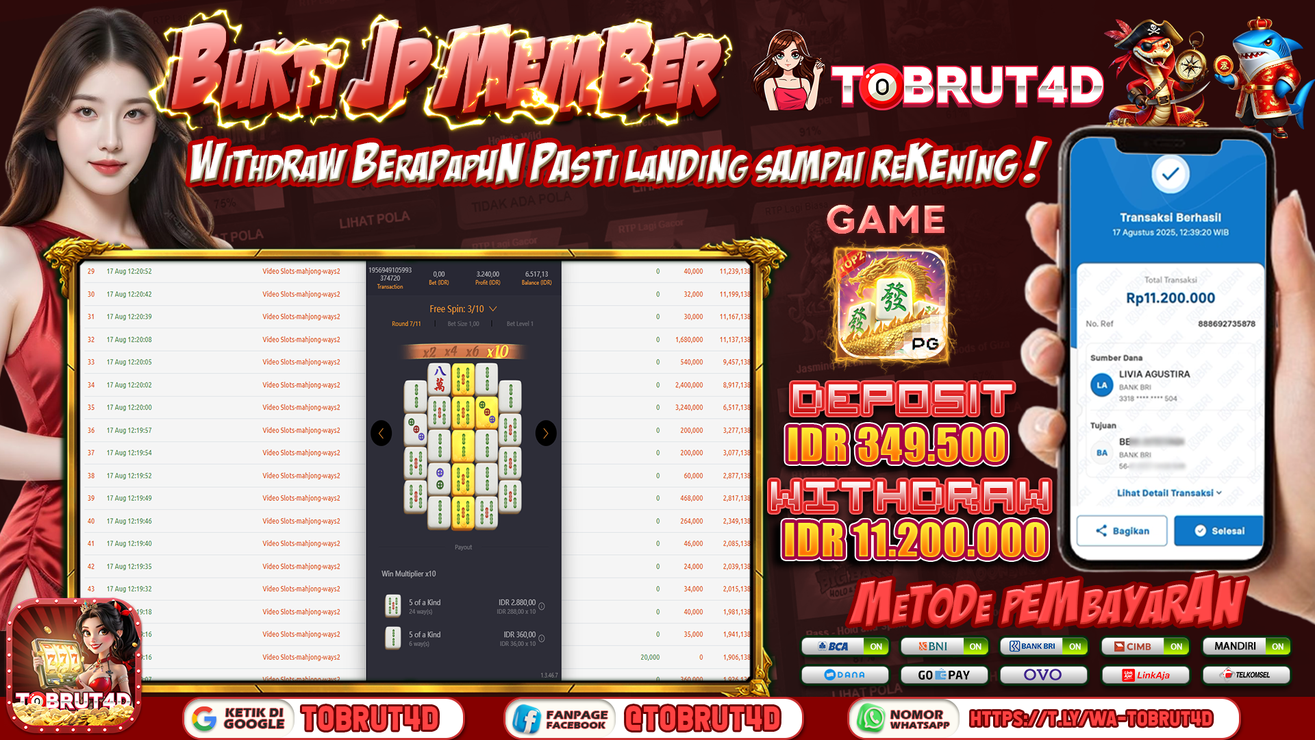 Selamat Kepada ID : K*****M Telah berhasil mendapatkan kemenangan besar pada permainan MAHJONG WAYS 2 kemenangan Sebesar 11.200.000,Setelah mengisi formulir withdraw dengan kurung waktu hanya 5 – 10 menit pihak tobrut4d sudah melakukan transfer kepada pemilik Userid dan dana sudah dapat di cairkan oleh pemenang. Bukti pembayaran yang kami berikan merupakan bukti pembayaran yang SAH / VALID yang langung di dapatkan melaui tanda transfer transaksi dari Bank yang di tuju.
