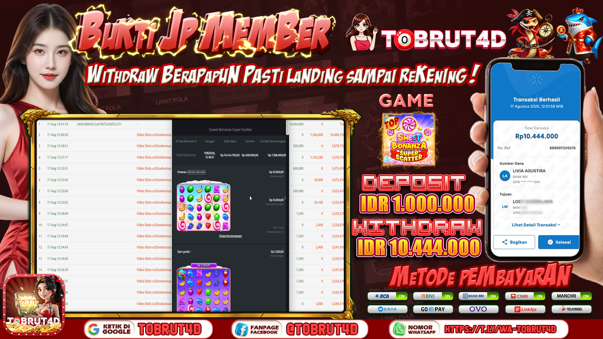Selamat Kepada ID : B*****E Telah berhasil mendapatkan kemenangan besar pada permainan SWEET BONANZA SUPER SCATTER kemenangan Sebesar 10.444.000,Setelah mengisi formulir withdraw dengan kurung waktu hanya 5 – 10 menit pihak tobrut4d sudah melakukan transfer kepada pemilik Userid dan dana sudah dapat di cairkan oleh pemenang. Bukti pembayaran yang kami berikan merupakan bukti pembayaran yang SAH / VALID yang langung di dapatkan melaui tanda transfer transaksi dari Bank yang di tuju.