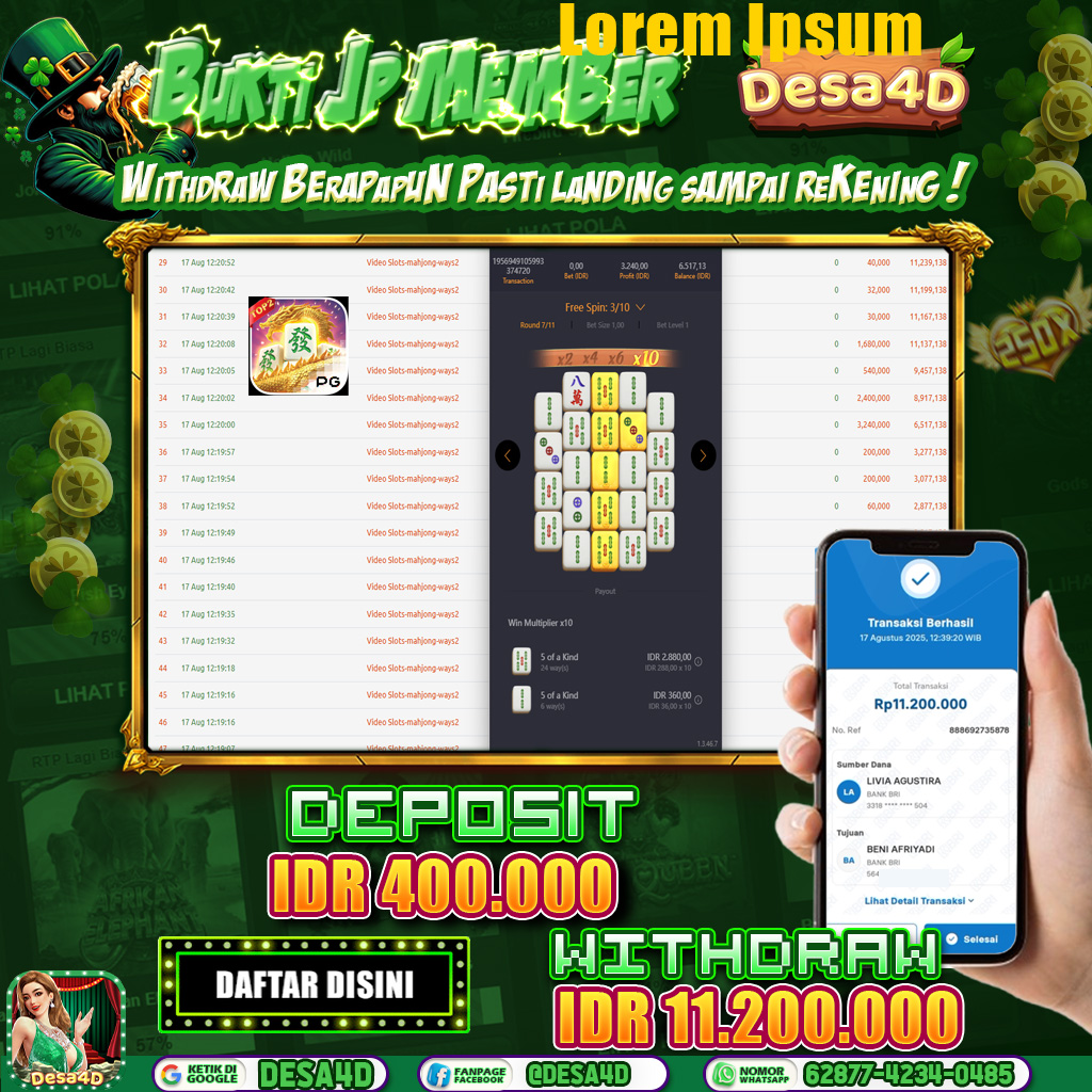 Tak hanya itu, kami juga menyediakan berbagai promo menarik, mulai dari bonus new member, cashback, hingga free spin setiap harinya! Sistem deposit dan withdraw kami cepat serta aman, didukung berbagai metode pembayaran termasuk e-wallet dan bank lokal. Bergabunglah sekarang dan rasakan sendiri keberuntungan Anda di DESA4D Situs Slot Gacor 2025, di mana jackpot besar selalu siap menanti Anda!