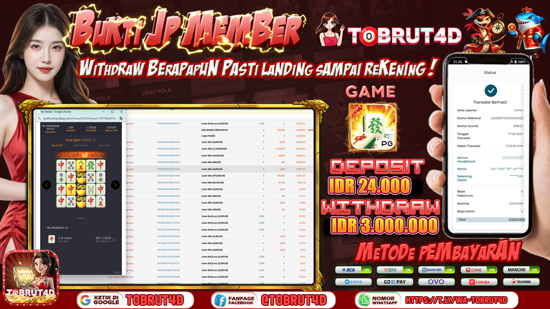 Selamat Kepada ID : B*****K Telah berhasil mendapatkan kemenangan besar pada permainan MAHJONG WAYS 1 kemenangan Sebesar 3.000.000,Setelah mengisi formulir withdraw dengan kurung waktu hanya 5 – 10 menit pihak tobrut4d sudah melakukan transfer kepada pemilik Userid dan dana sudah dapat di cairkan oleh pemenang. Bukti pembayaran yang kami berikan merupakan bukti pembayaran yang SAH / VALID yang langung di dapatkan melaui tanda transfer transaksi dari Bank yang di tuju.