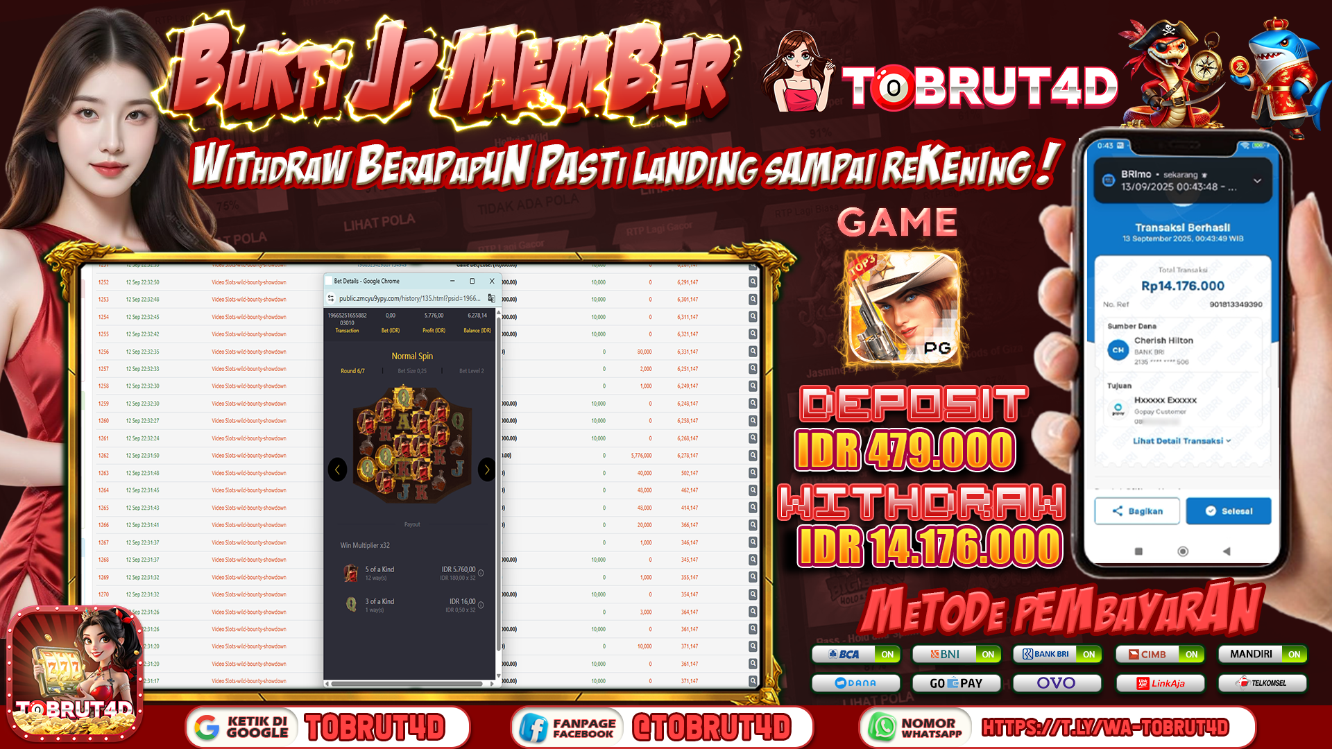 Selamat Kepada ID :M****23 Telah berhasil mendapatkan kemenangan besar pada permainan WILD BOUNTY SHOWDOWN kemenangan Sebesar 14.176.000,Setelah mengisi formulir withdraw dengan kurung waktu hanya 5 – 10 menit pihak tobrut4d sudah melakukan transfer kepada pemilik Userid dan dana sudah dapat di cairkan oleh pemenang. Bukti pembayaran yang kami berikan merupakan bukti pembayaran yang SAH / VALID yang langung di dapatkan melaui tanda transfer transaksi dari Bank yang di tuju.
