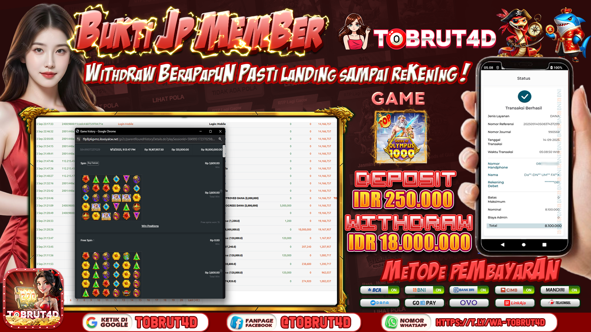Selamat Kepada ID :S****120 Telah berhasil mendapatkan kemenangan besar pada permainan GATES OF OLYMPUS 1000 kemenangan Sebesar 18.000.000,Setelah mengisi formulir withdraw dengan kurung waktu hanya 5 – 10 menit pihak tobrut4d sudah melakukan transfer kepada pemilik Userid dan dana sudah dapat di cairkan oleh pemenang. Bukti pembayaran yang kami berikan merupakan bukti pembayaran yang SAH / VALID yang langung di dapatkan melaui tanda transfer transaksi dari Bank yang di tuju.