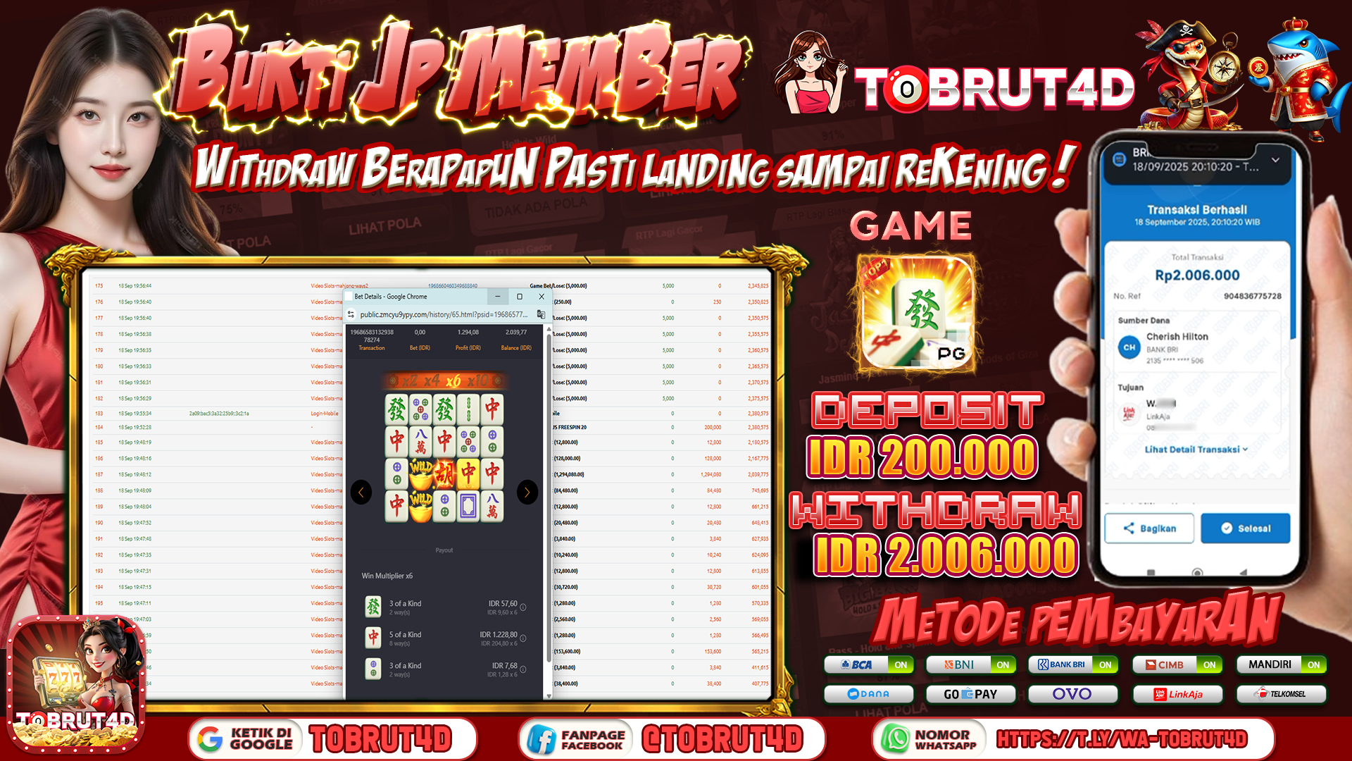 Selamat Kepada ID :MA****G Telah berhasil mendapatkan kemenangan besar pada permainan MAHJONG WAYS 1 kemenangan Sebesar 2.006.000,Setelah mengisi formulir withdraw dengan kurung waktu hanya 5 – 10 menit pihak tobrut4d sudah melakukan transfer kepada pemilik Userid dan dana sudah dapat di cairkan oleh pemenang. Bukti pembayaran yang kami berikan merupakan bukti pembayaran yang SAH / VALID yang langung di dapatkan melaui tanda transfer transaksi dari Bank yang di tuju.