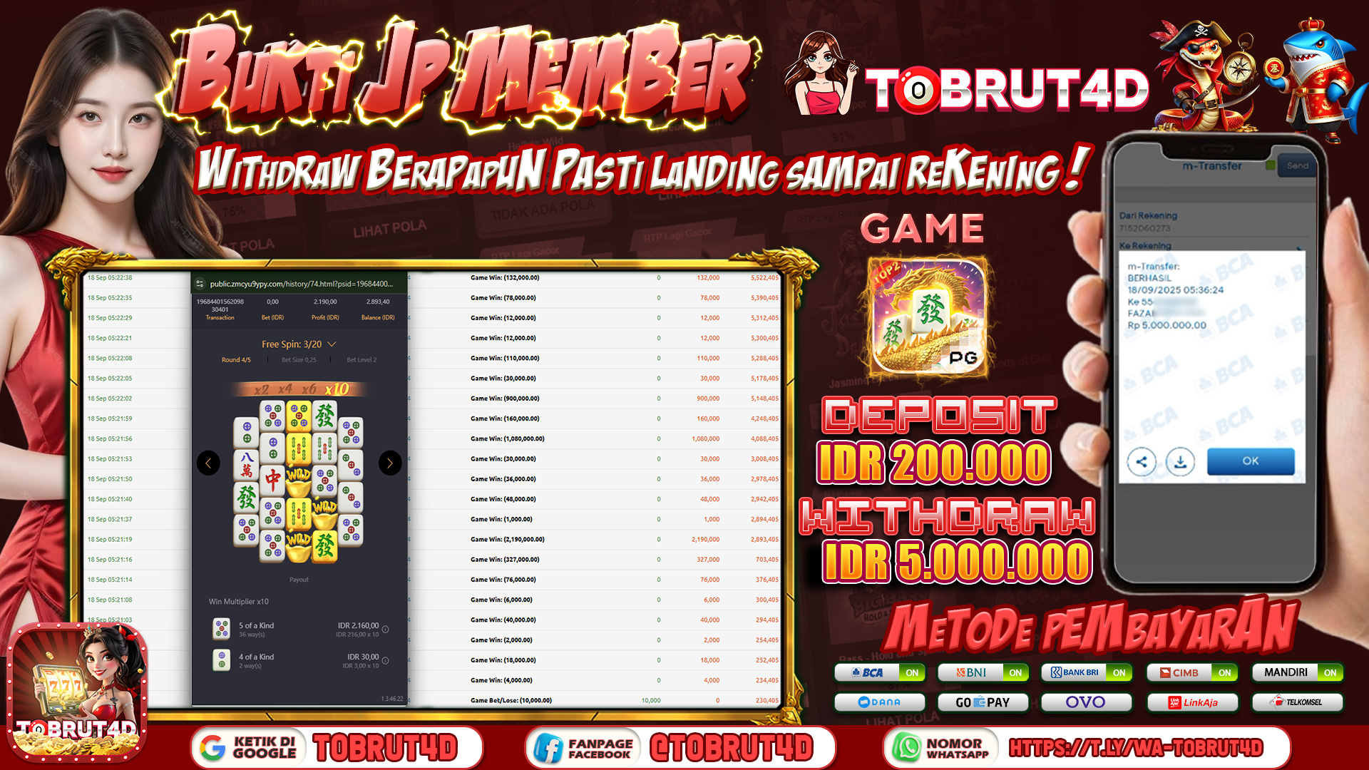 Selamat Kepada ID :JU****NG Telah berhasil mendapatkan kemenangan besar pada permainan MAHJONG WAYS 2 kemenangan Sebesar 5.000.000,Setelah mengisi formulir withdraw dengan kurung waktu hanya 5 – 10 menit pihak tobrut4d sudah melakukan transfer kepada pemilik Userid dan dana sudah dapat di cairkan oleh pemenang. Bukti pembayaran yang kami berikan merupakan bukti pembayaran yang SAH / VALID yang langung di dapatkan melaui tanda transfer transaksi dari Bank yang di tuju.