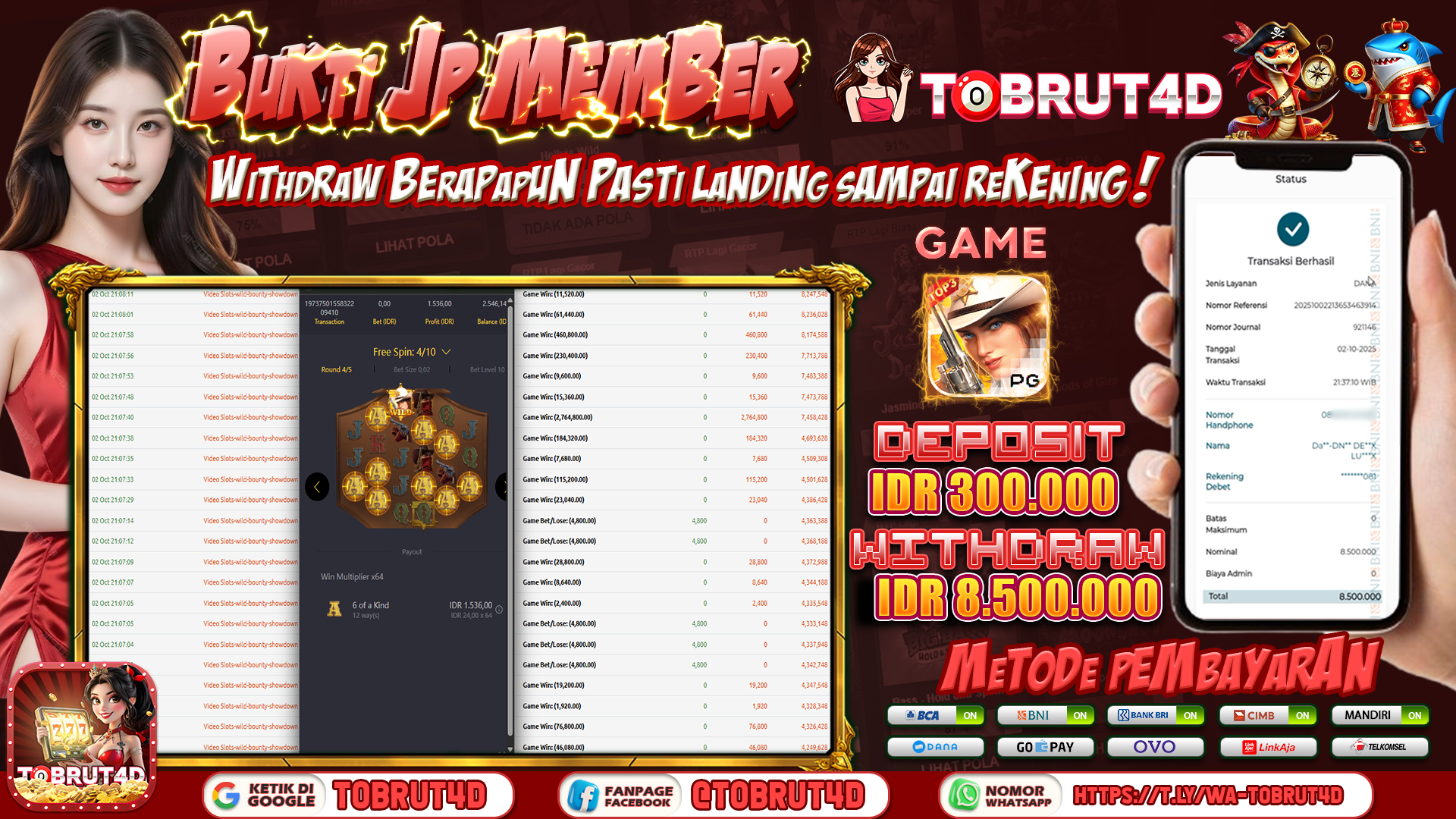 Selamat Kepada ID :DE****E Telah berhasil mendapatkan kemenangan besar pada permainan WILD BOUNTY SHOWDOWN kemenangan Sebesar 8.500.000,Setelah mengisi formulir withdraw dengan kurung waktu hanya 5 – 10 menit pihak tobrut4d sudah melakukan transfer kepada pemilik Userid dan dana sudah dapat di cairkan oleh pemenang. Bukti pembayaran yang kami berikan merupakan bukti pembayaran yang SAH / VALID yang langung di dapatkan melaui tanda transfer transaksi dari Bank yang di tuju.
