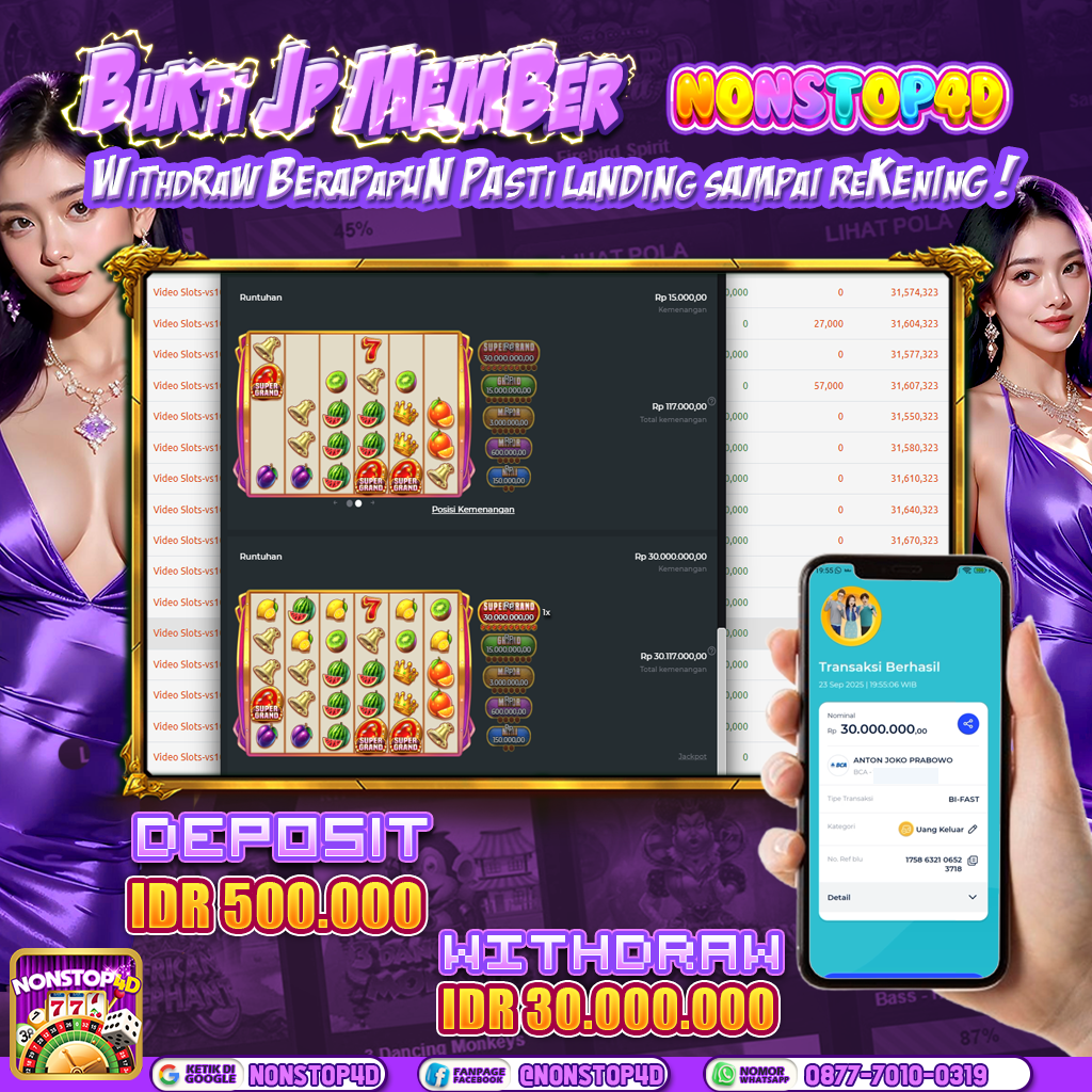Tak hanya itu, kami juga menyediakan berbagai promo menarik, mulai dari bonus new member, cashback, hingga free spin setiap harinya! Sistem deposit dan withdraw kami cepat serta aman, didukung berbagai metode pembayaran termasuk e-wallet dan bank lokal. Bergabunglah sekarang dan rasakan sendiri keberuntungan Anda di NONSTOP4D Situs Slot Gacor 2025, di mana jackpot besar selalu siap menanti Anda!