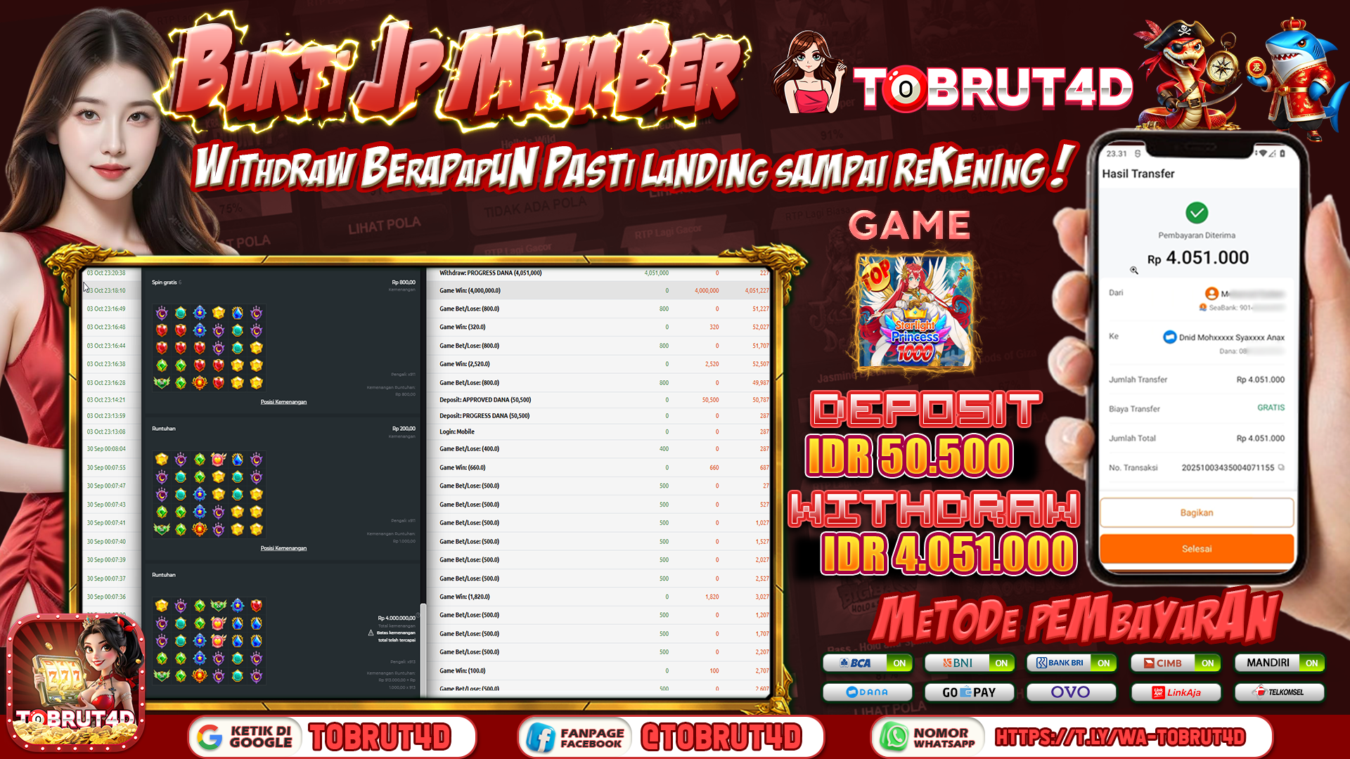 Selamat Kepada ID :SY****AM Telah berhasil mendapatkan kemenangan besar pada permainan PRINCESS STARLIGHT 1000 kemenangan Sebesar 4.051.000,Setelah mengisi formulir withdraw dengan kurung waktu hanya 5 – 10 menit pihak tobrut4d sudah melakukan transfer kepada pemilik Userid dan dana sudah dapat di cairkan oleh pemenang. Bukti pembayaran yang kami berikan merupakan bukti pembayaran yang SAH / VALID yang langung di dapatkan melaui tanda transfer transaksi dari Bank yang di tuju.