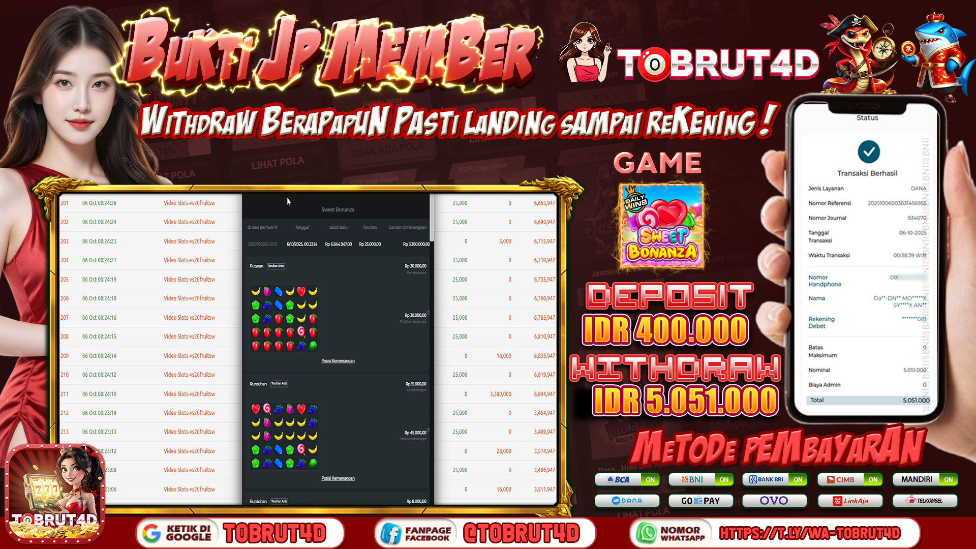 Selamat Kepada ID :T****I Telah berhasil mendapatkan kemenangan besar pada permainan SWEET BONANZA kemenangan Sebesar 5.051.000,Setelah mengisi formulir withdraw dengan kurung waktu hanya 5 – 10 menit pihak tobrut4d sudah melakukan transfer kepada pemilik Userid dan dana sudah dapat di cairkan oleh pemenang. Bukti pembayaran yang kami berikan merupakan bukti pembayaran yang SAH / VALID yang langung di dapatkan melaui tanda transfer transaksi dari Bank yang di tuju.