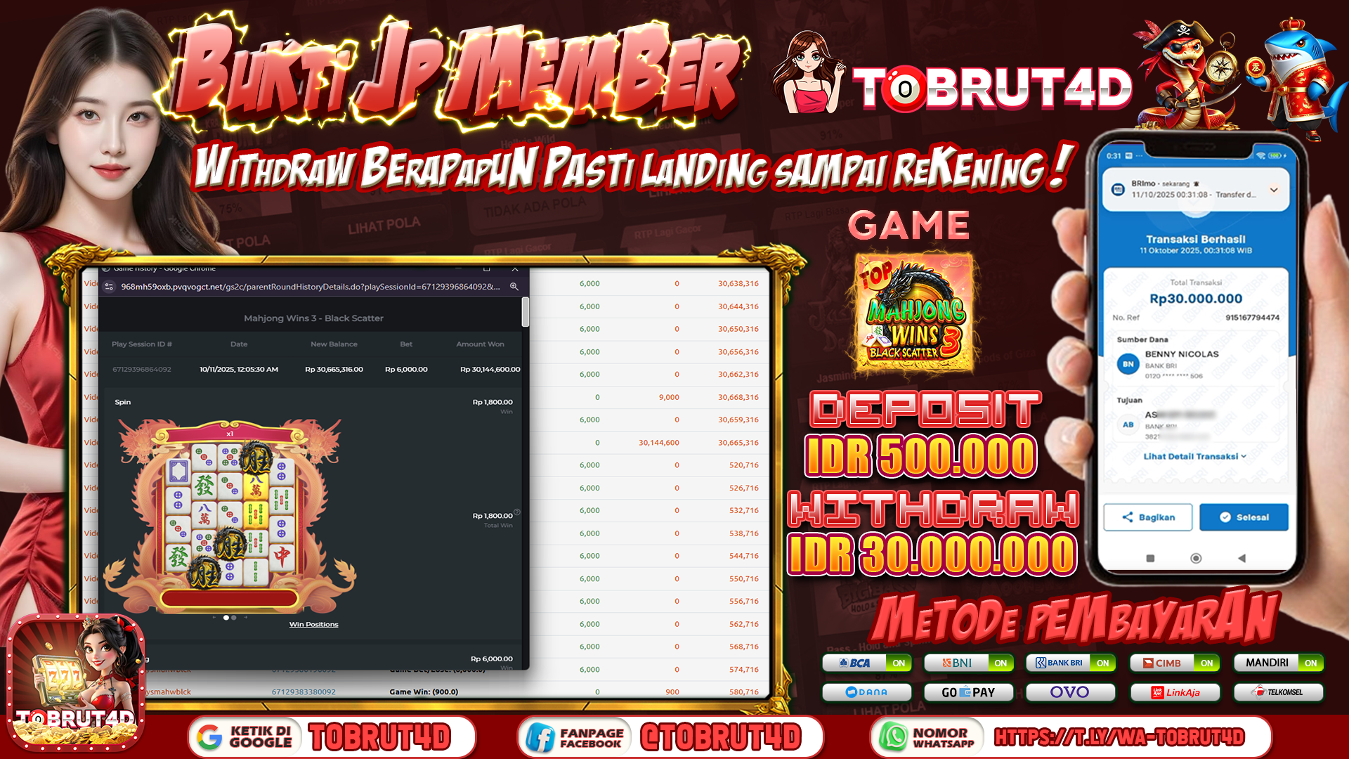 Selamat Kepada ID :A***B***R Telah berhasil mendapatkan kemenangan besar pada permainan MAHJONG WINS 3 BLACK SCATTER kemenangan Sebesar 30.000.000,Setelah mengisi formulir withdraw dengan kurung waktu hanya 5 – 10 menit pihak tobrut4d sudah melakukan transfer kepada pemilik Userid dan dana sudah dapat di cairkan oleh pemenang. Bukti pembayaran yang kami berikan merupakan bukti pembayaran yang SAH / VALID yang langung di dapatkan melaui tanda transfer transaksi dari Bank yang di tuju.