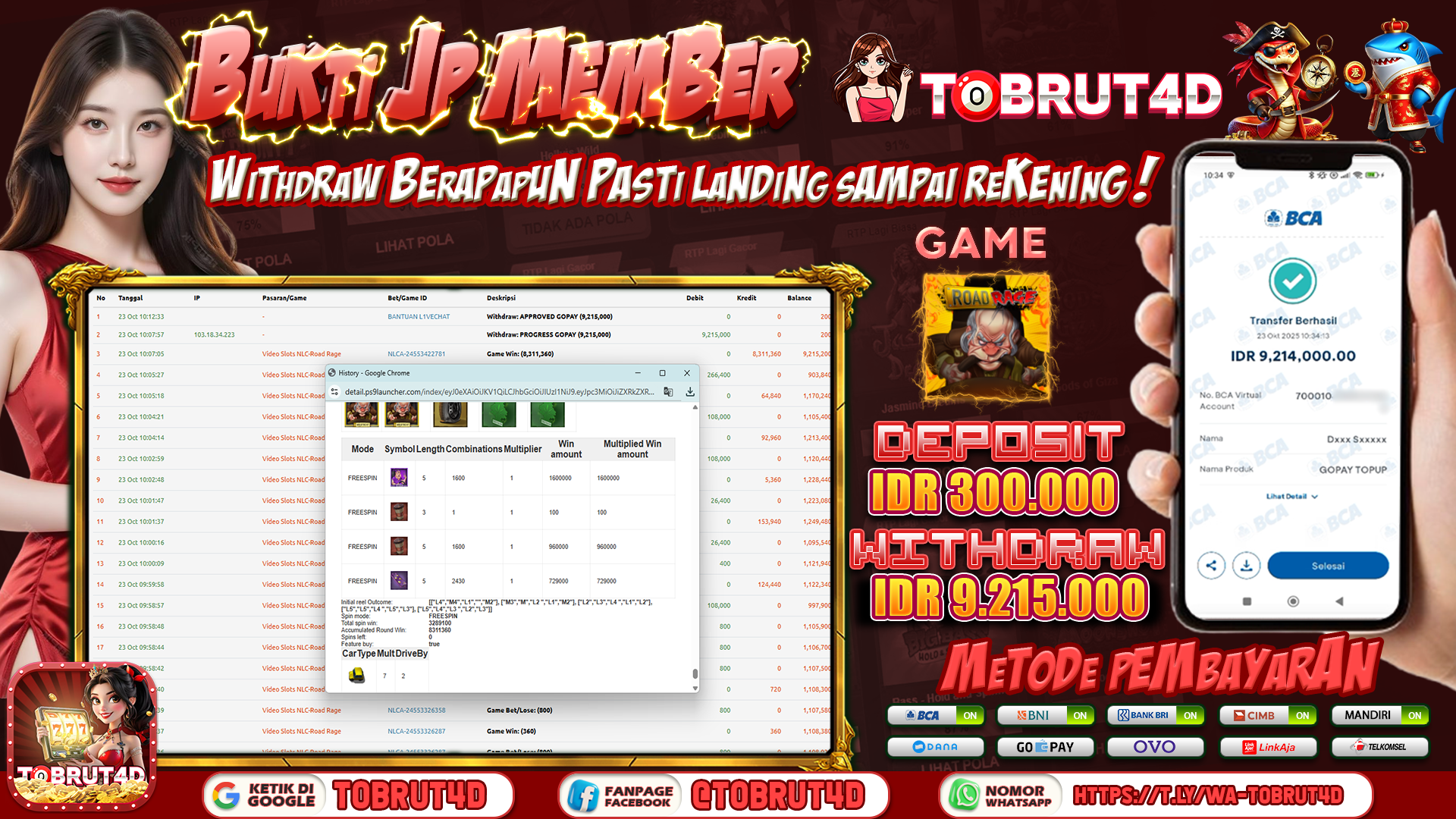 Selamat Kepada ID :B****E Telah berhasil mendapatkan kemenangan besar pada permainan WILD APE kemenangan Sebesar 9.215.000,Setelah mengisi formulir withdraw dengan kurung waktu hanya 5 – 10 menit pihak tobrut4d sudah melakukan transfer kepada pemilik Userid dan dana sudah dapat di cairkan oleh pemenang. Bukti pembayaran yang kami berikan merupakan bukti pembayaran yang SAH / VALID yang langung di dapatkan melaui tanda transfer transaksi dari Bank yang di tuju.