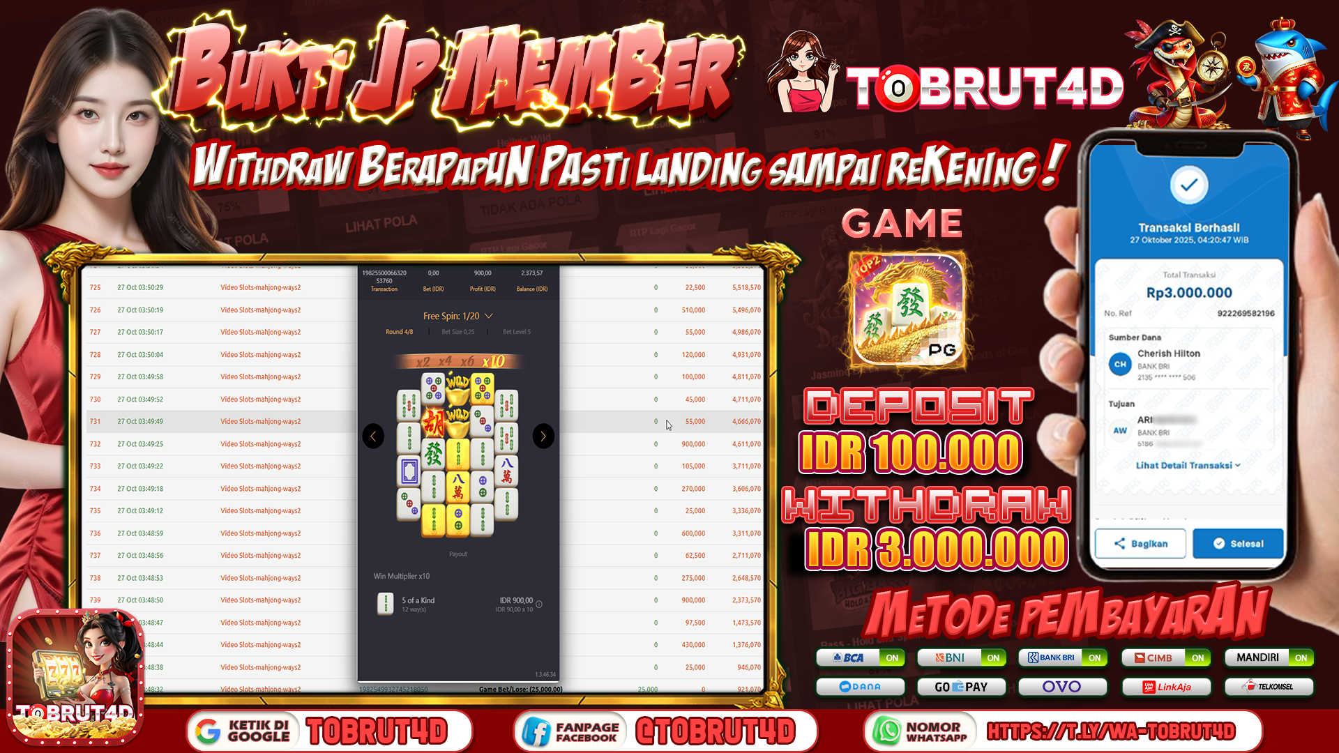 Selamat Kepada ID :A****L Telah berhasil mendapatkan kemenangan besar pada permainan MAHJONG WAYS 2 kemenangan Sebesar 3.000.000,Setelah mengisi formulir withdraw dengan kurung waktu hanya 5 – 10 menit pihak tobrut4d sudah melakukan transfer kepada pemilik Userid dan dana sudah dapat di cairkan oleh pemenang. Bukti pembayaran yang kami berikan merupakan bukti pembayaran yang SAH / VALID yang langung di dapatkan melaui tanda transfer transaksi dari Bank yang di tuju.