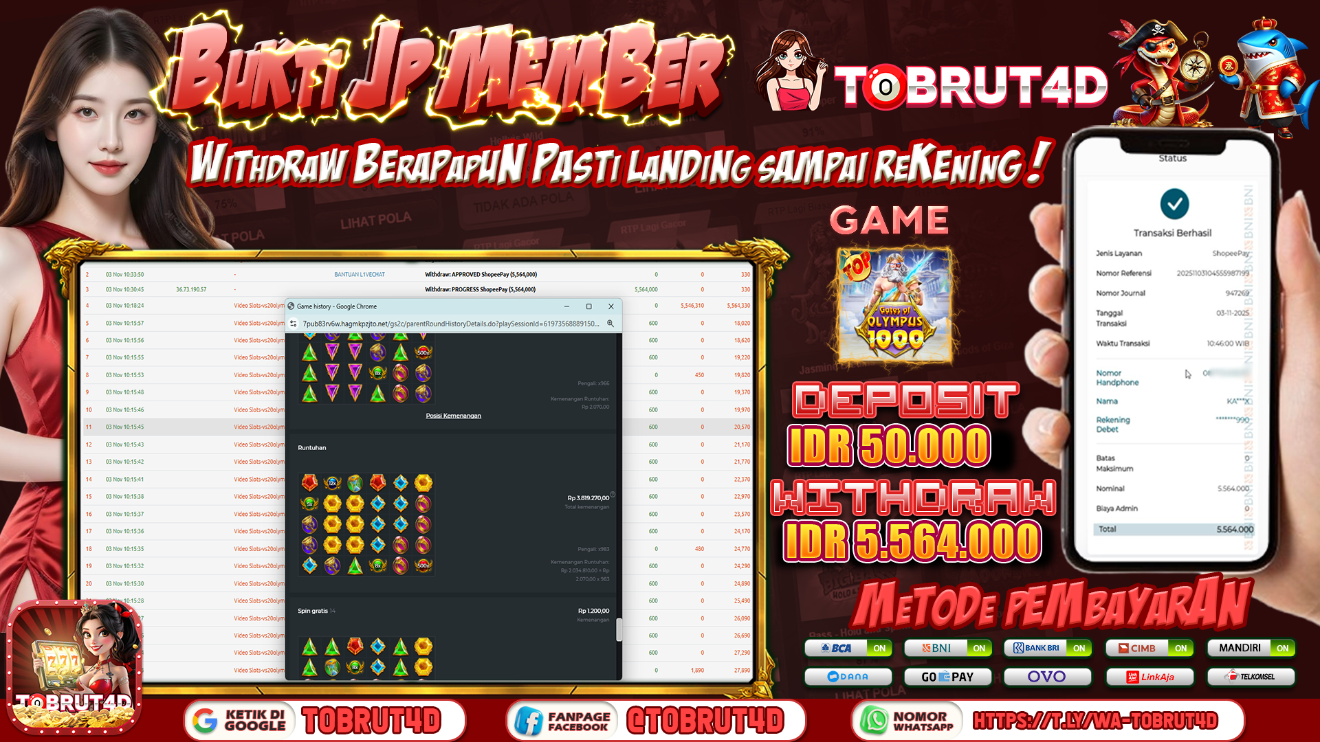 Selamat Kepada ID :Y****N Telah berhasil mendapatkan kemenangan besar pada permainan GATES OF OLYMPUS 1000 kemenangan Sebesar 5.564.000,Setelah mengisi formulir withdraw dengan kurung waktu hanya 5 – 10 menit pihak tobrut4d sudah melakukan transfer kepada pemilik Userid dan dana sudah dapat di cairkan oleh pemenang. Bukti pembayaran yang kami berikan merupakan bukti pembayaran yang SAH / VALID yang langung di dapatkan melaui tanda transfer transaksi dari Bank yang di tuju.