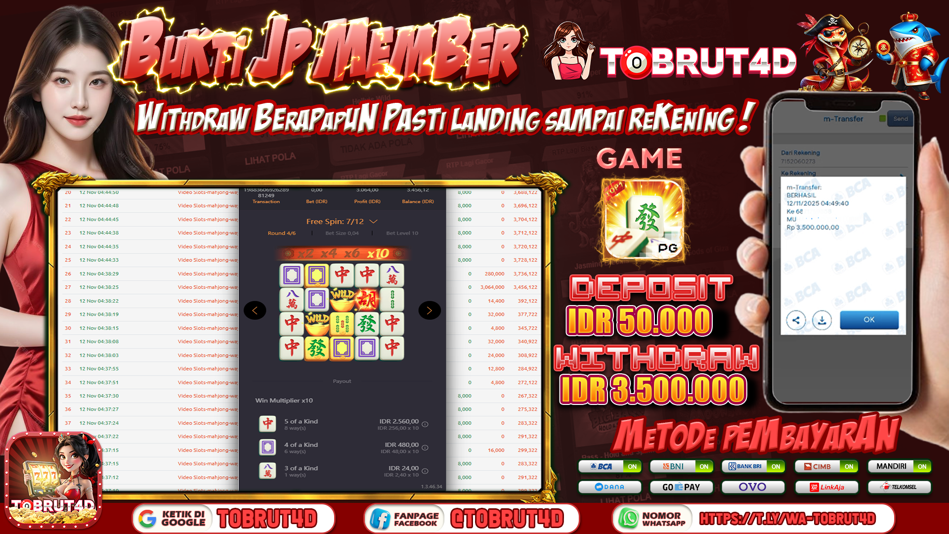 Selamat Kepada ID :LA****1908 Telah berhasil mendapatkan kemenangan besar pada permainan MAHJONG WAYS 1 kemenangan Sebesar 3.500.000,Setelah mengisi formulir withdraw dengan kurung waktu hanya 5 – 10 menit pihak tobrut4d sudah melakukan transfer kepada pemilik Userid dan dana sudah dapat di cairkan oleh pemenang. Bukti pembayaran yang kami berikan merupakan bukti pembayaran yang SAH / VALID yang langung di dapatkan melaui tanda transfer transaksi dari Bank yang di tuju.