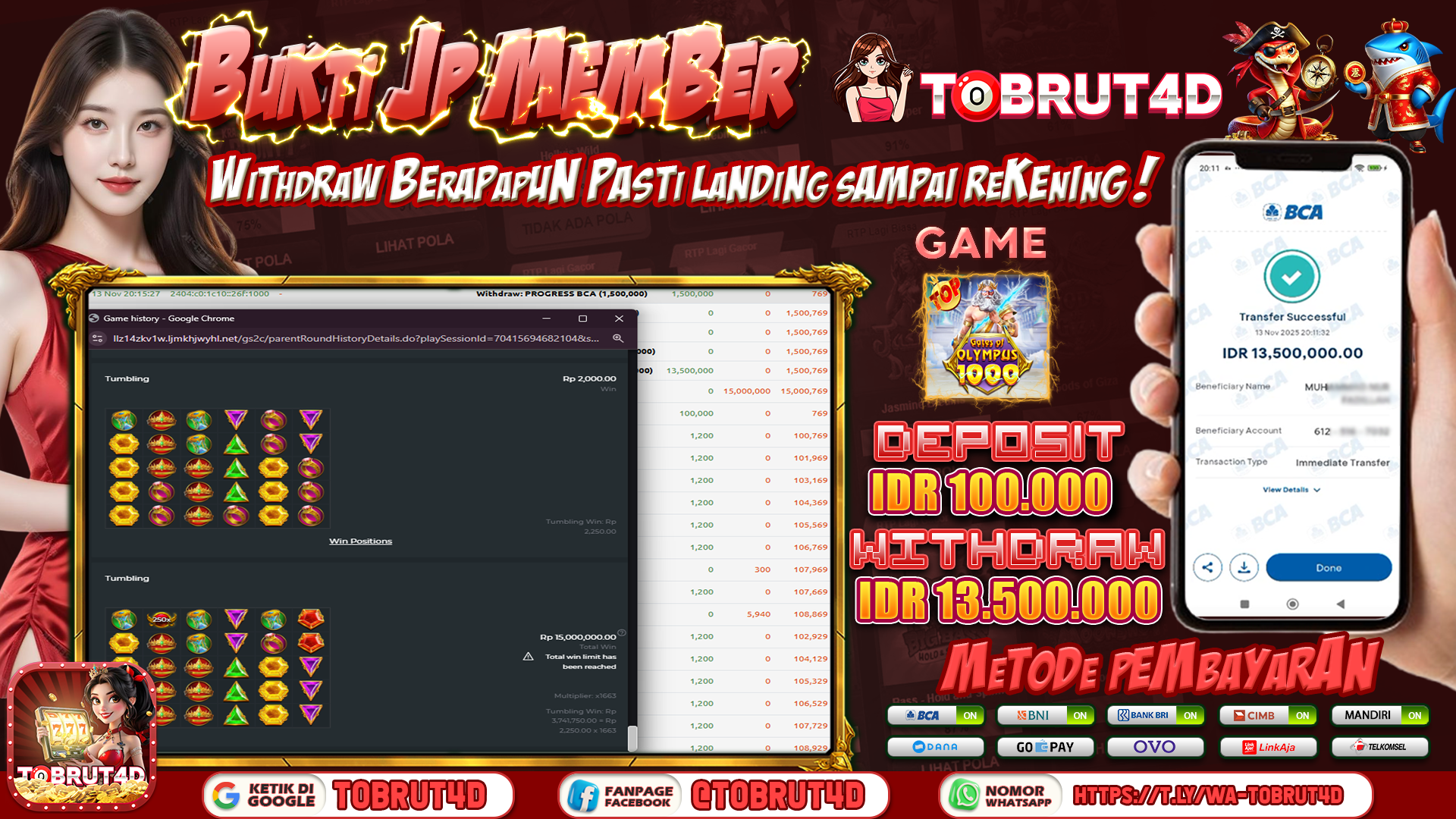 Selamat Kepada ID Y***808 Telah berhasil mendapatkan kemenangan besar pada permainan GATES OF OLYMPUS 1000 kemenangan Sebesar 13.500.000,Setelah mengisi formulir withdraw dengan kurung waktu hanya 5 – 10 menit pihak tobrut4d sudah melakukan transfer kepada pemilik Userid dan dana sudah dapat di cairkan oleh pemenang. Bukti pembayaran yang kami berikan merupakan bukti pembayaran yang SAH / VALID yang langung di dapatkan melaui tanda transfer transaksi dari Bank yang di tuju.