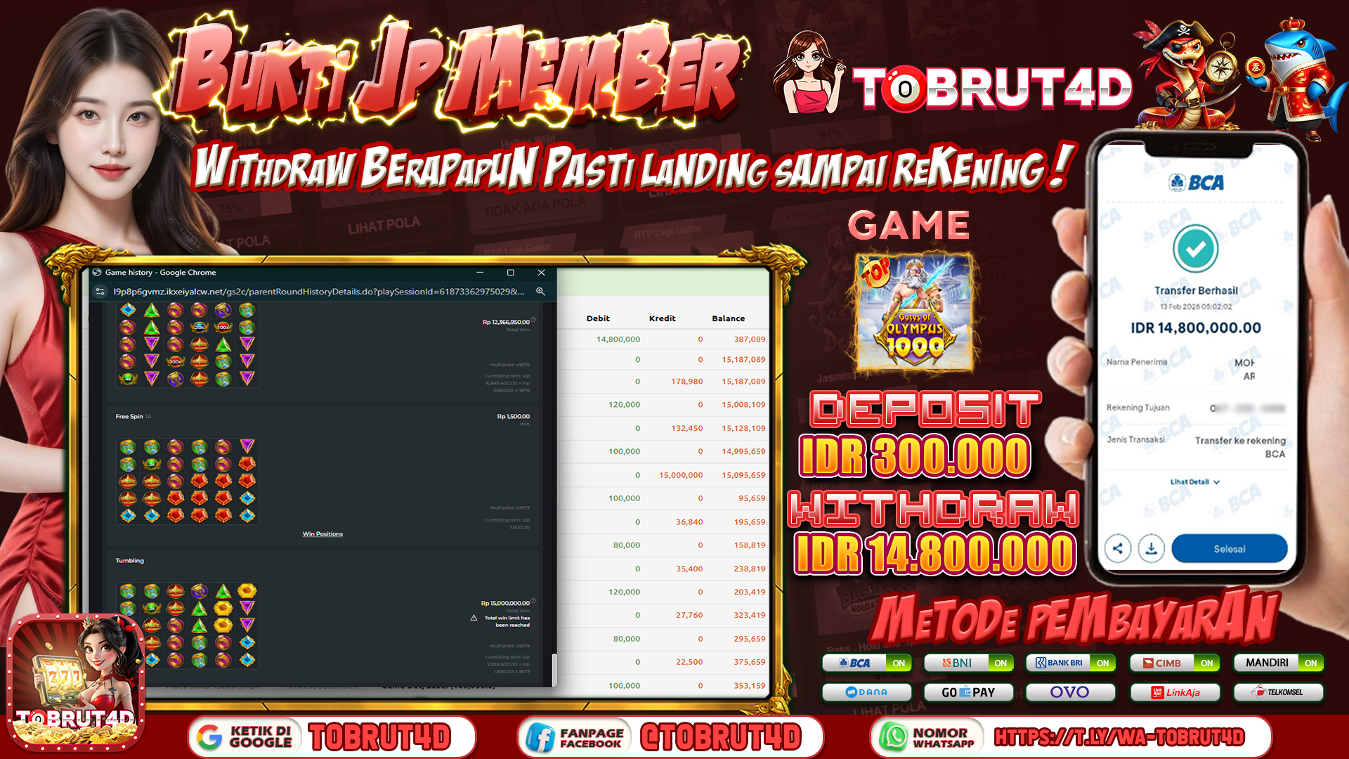 Selamat Kepada ID :A****K Telah berhasil mendapatkan kemenangan besar pada permainan GATES OF OLYMPUS 1000 kemenangan Sebesar 14.800.000,Setelah mengisi formulir withdraw dengan kurung waktu hanya 5 – 10 menit pihak tobrut4d sudah melakukan transfer kepada pemilik Userid dan dana sudah dapat di cairkan oleh pemenang. Bukti pembayaran yang kami berikan merupakan bukti pembayaran yang SAH / VALID yang langung di dapatkan melaui tanda transfer transaksi dari Bank yang di tuju.