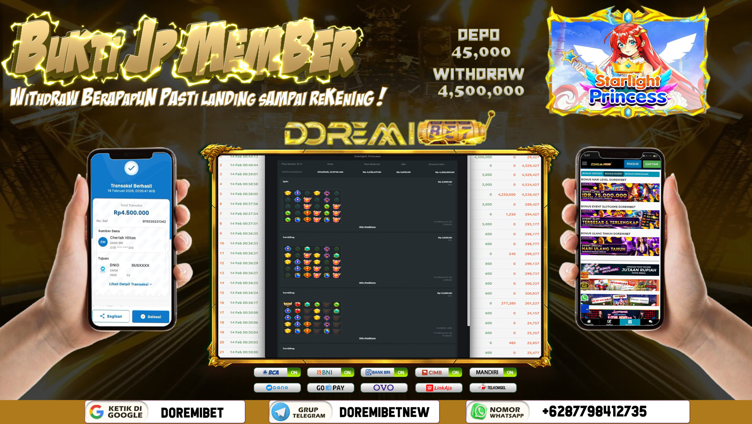 Selamat Kepada ID : D8***0  Telah berhasil mendapatkan kemenangan besar pada permainan STARLIGHT PRINCESS kemenangan Sebesar 4,500,000, Setelah mengisi formulir withdraw dengan kurung waktu hanya 5 – 10 menit pihak DOREMIBET sudah melakukan transfer kepada pemilik User id dan dana sudah dapat di cairkan oleh pemenang. Bukti pembayaran yang kami berikan merupakan bukti pembayaran yang SAH / VALID yang langung di dapatkan melaui tanda transfer transaksi dari Bank yang di tuju.