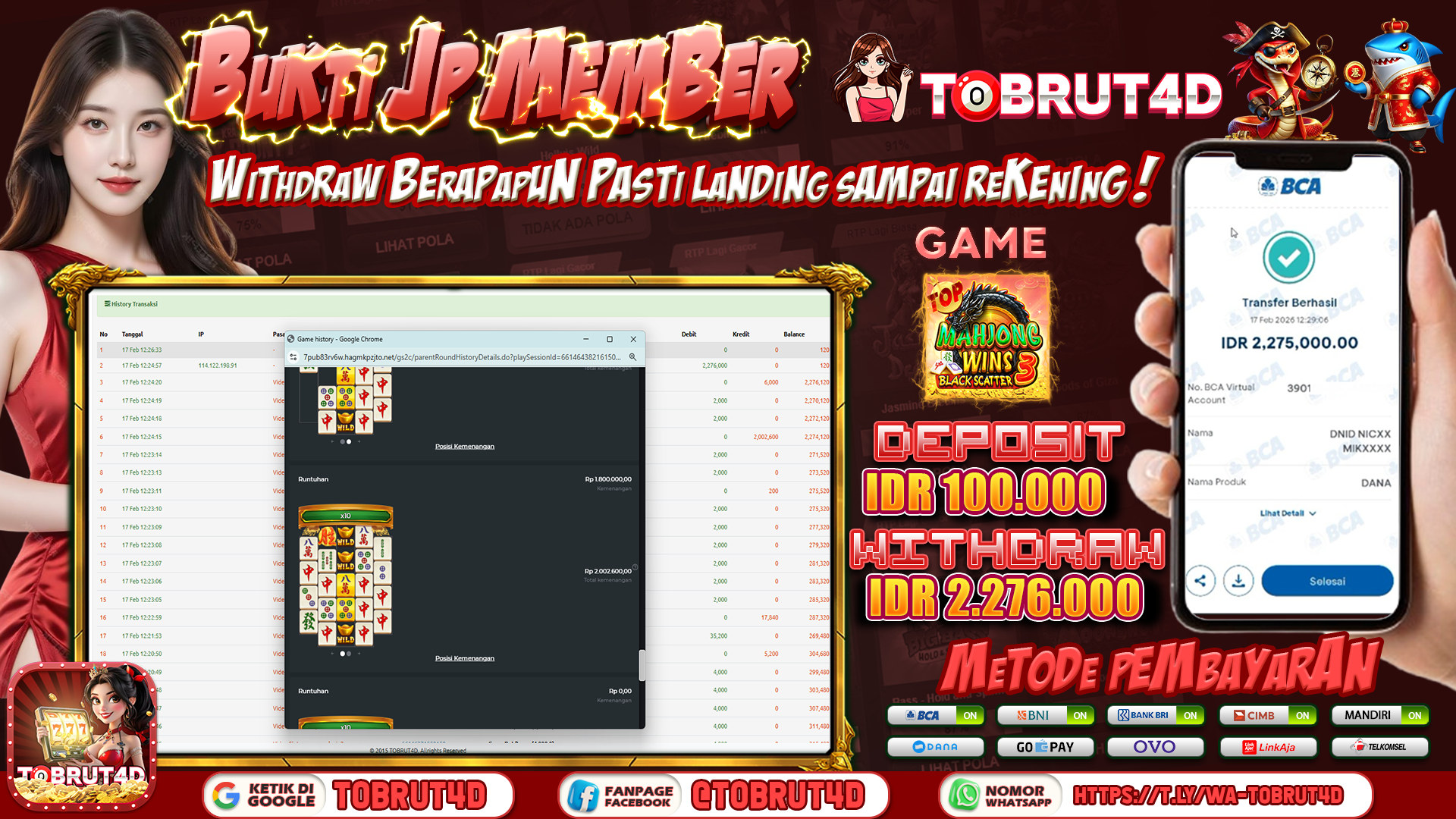 Selamat Kepada ID :H****I Telah berhasil mendapatkan kemenangan besar pada permainan MAHJONG WINS 3 BLACK SCATTER kemenangan Sebesar 2.276.000,Setelah mengisi formulir withdraw dengan kurung waktu hanya 5 – 10 menit pihak tobrut4d sudah melakukan transfer kepada pemilik Userid dan dana sudah dapat di cairkan oleh pemenang. Bukti pembayaran yang kami berikan merupakan bukti pembayaran yang SAH / VALID yang langung di dapatkan melaui tanda transfer transaksi dari Bank yang di tuju.